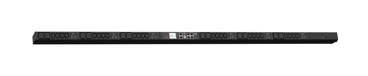 Monitored rack power distribution unit (0U [vertical], 14.4kVA, 36 outlets). INPUT: 208v (3-phase DELTA), 50a - CS8365C plug (3P4W); OUTPUT: 24@ C13, 12@ C19 outlets; on 6@ 2-pole, 20a Overcurrent Protectors; FEATURES: Billing-Grade (+/- 1%) Energy Metering [kW, kVA, V, A, Power Factor] - per inlet, per breaker/fuse; Remote network monitoring via HTML, JSON-RPC, SSH, Telnet, MODBUS/TCP, and SNMPv3. Onboard embedded processor with minimum 536MHz clock speed, 16MB SPI Flash, and 64MB DDR2 RAM. Cascading upto 16 PDU's using single Ethernet or USB connection. Environmental monitoring [temp/humidity] capable – up to 32 sensors. Individual outlet numbers labeled on chassis. Automated deployment via TFTP, DHCP, SSH(CLI), or USB Flash Drives. WiFi Capable. USB Webcam Capable. iPad/iPhone/Android App. Dual 10/100/1000 Ethernet port. Breaker metering and alarming (0V detection). Max Dimensions 45mm x 80mm x 1780mm (1.8in x 3.1in x 70.1in). Max Weight 10.3 kg. Maximum ambient temperature 60C at full load.