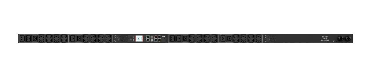 Monitored rack power distribution unit (0U [vertical], 6kVA, 30 outlets). INPUT: 200v, 30a - NEMA L6-30P plug (2P3W); OUTPUT: 24@ C13, 6@ C19 outlets; on 2@ 2-pole, 20a Overcurrent Protectors; FEATURES: Billing-Grade (+/- 1%) Energy Metering [kW, kVA, V, A, Power Factor] - per inlet, per breaker/fuse; Remote network monitoring via HTML, JSON-RPC, SSH, Telnet, MODBUS/TCP, and SNMPv3. Onboard embedded processor with minimum 536MHz clock speed, 16MB SPI Flash, and 64MB DDR2 RAM. Cascading upto 16 PDU's using single Ethernet or USB connection. Environmental monitoring [temp/humidity] capable – up to 32 sensors. Individual outlet numbers labeled on chassis. Automated deployment via TFTP, DHCP, SSH(CLI), or USB Flash Drives. WiFi Capable. USB Webcam Capable. iPad/iPhone/Android App. Dual 10/100/1000 Ethernet port. Breaker metering and alarming (0V detection). Max Dimensions 52mm x 55mm x 1780mm (2.1in x 2.2in x 70.1in). Max Weight 5.5 kg. Maximum ambient temperature 60C at full load.