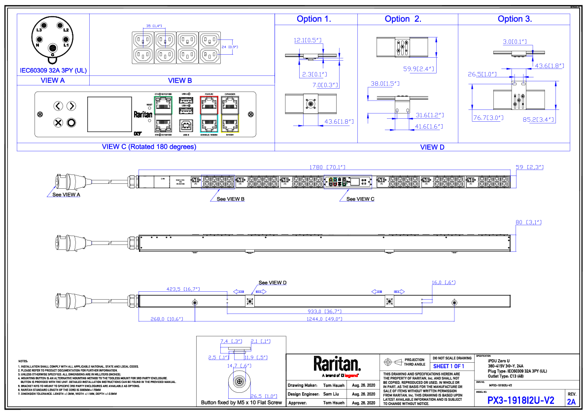 The PX3-1918I2U-V2 features a robust IEC 60309 3P+N+E 6h 32A input plug configured for Wye top-to-top feed, ensuring reliable connection to three-phase power sources. The zero-U vertical form factor maximizes rack space efficiency while providing easy access to all 48 outlets. The integrated high-resolution color display provides clear visibility of power metrics and system status.