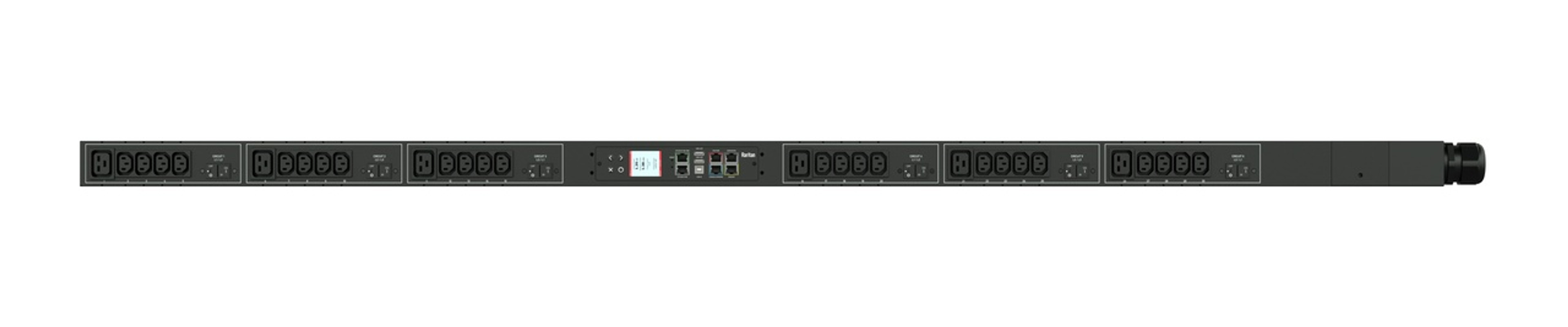 Monitored rack power distribution unit (0U [vertical], 14.4kVA, 30 outlets). INPUT: 208v (3-phase DELTA), 50a - CS8365C plug (3P4W); OUTPUT: 24@ C13, 6@ C19 outlets; on 6@ 2-pole, 20a Overcurrent Protectors; FEATURES: Billing-Grade (+/- 1%) Energy Metering [kW, kVA, V, A, Power Factor] - per inlet, per breaker/fuse; Remote network monitoring via HTML, JSON-RPC, SSH, Telnet, MODBUS/TCP, and SNMPv3. Onboard embedded processor with minimum 536MHz clock speed, 16MB SPI Flash, and 64MB DDR2 RAM. Cascading upto 16 PDU's using single Ethernet or USB connection. Environmental monitoring [temp/humidity] capable – up to 32 sensors. Individual outlet numbers labeled on chassis. Automated deployment via TFTP, DHCP, SSH(CLI), or USB Flash Drives. WiFi Capable. USB Webcam Capable. iPad/iPhone/Android App. Dual 10/100/1000 Ethernet port. Breaker metering and alarming (0V detection). Max Dimensions 59mm x 80mm x 1780mm (2.3in x 3.2in x 70.1in). Max Weight 9.5 kg. Maximum ambient temperature 60C at full load.