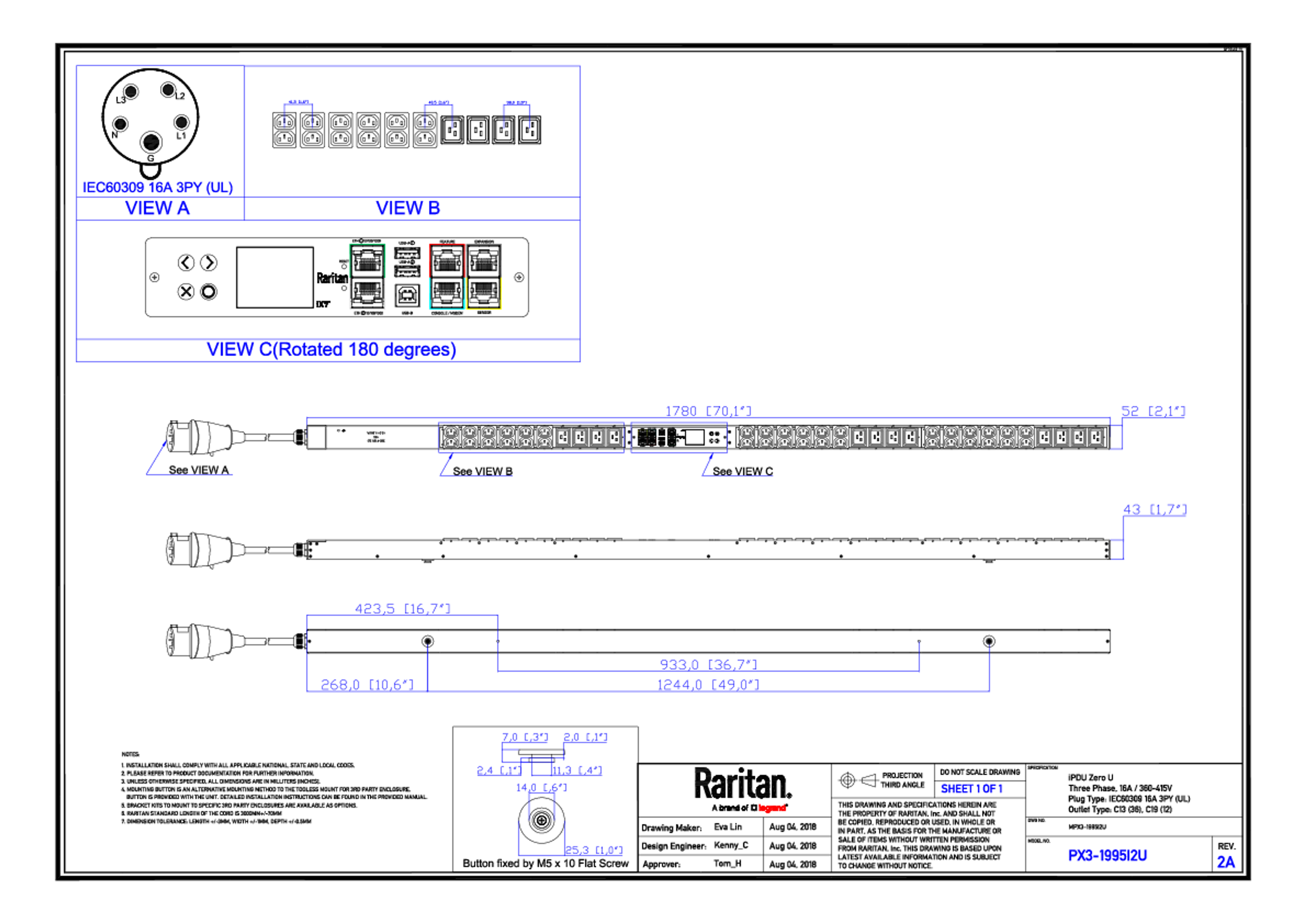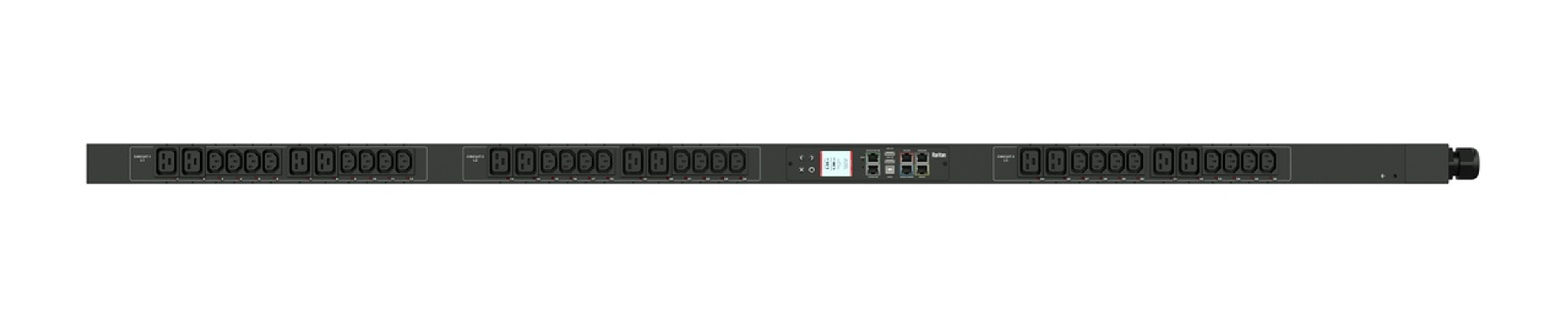 3PH, 415V AC, 16A (16A/PH rated); 48 outlets: 36x C13, 12x C19; plug: IEC 60309 3P+N+E 6h 16A (Wye Top-top feed), 11.5kVA; Unit Metered, Zero U vertical PDU, SecureLock ready, high resolution color display with field replaceable controller, Ethernet, serial, 2x USB-A, USB-B and sensor connections