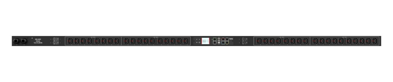 Monitored rack power distribution unit (0U [vertical], 6kVA, 24 outlets). INPUT: 200v, 30a - NEMA L6-30P plug (2P3W); OUTPUT: 24@ C13 outlets; on 2@ 2-pole, 20a Overcurrent Protectors; FEATURES: Billing-Grade (+/- 1%) Energy Metering [kW, kVA, V, A, Power Factor] - per inlet, per breaker/fuse, per outlet; Remote network monitoring via HTML, JSON-RPC, SSH, Telnet, MODBUS/TCP, and SNMPv3. Onboard embedded processor with minimum 536MHz clock speed, 16MB SPI Flash, and 64MB DDR2 RAM. Cascading upto 16 PDU's using single Ethernet or USB connection. Environmental monitoring [temp/humidity] capable – up to 32 sensors. Individual outlet numbers labeled on chassis. Automated deployment via TFTP, DHCP, SSH(CLI), or USB Flash Drives. WiFi Capable. USB Webcam Capable. iPad/iPhone/Android App. Dual 10/100/1000 Ethernet port. Tri-color status LED per receptacle. Breaker metering and alarming (0V detection). Max Dimensions 52mm x 65mm x 1539mm (2.1in x 2.6in x 60.6in). Max Weight TBD. Maximum ambient temperature 60C at full load.