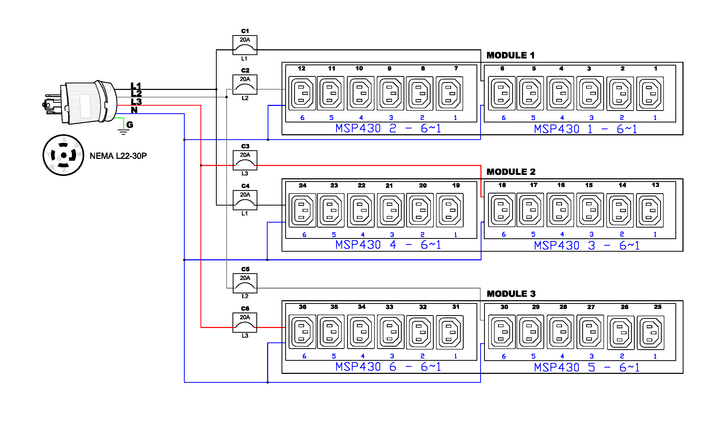 3PH, 415V AC, 30A (24A/PH rated); 36 outlets: 36x C13; plug: NEMA L22-30P (Wye Top-top feed), 17.3kVA; Outlet Metered, Zero U vertical PDU