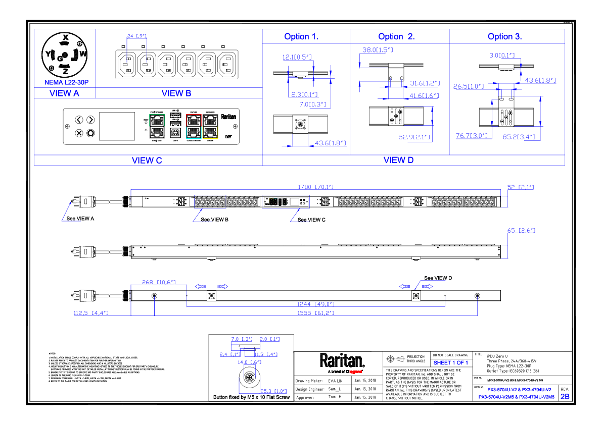 3PH, 415V AC, 30A (24A/PH rated); 36 outlets: 36x C13; plug: NEMA L22-30P (Wye Top-top feed), 17.3kVA; Outlet Metered, Zero U vertical PDU, SecureLock ready, V2 Outlet Sequence, high resolution color display with field replaceable controller, Ethernet, serial, 2x USB-A, USB-B and sensor connections