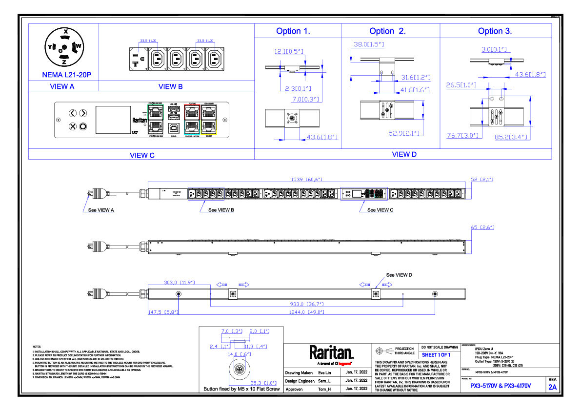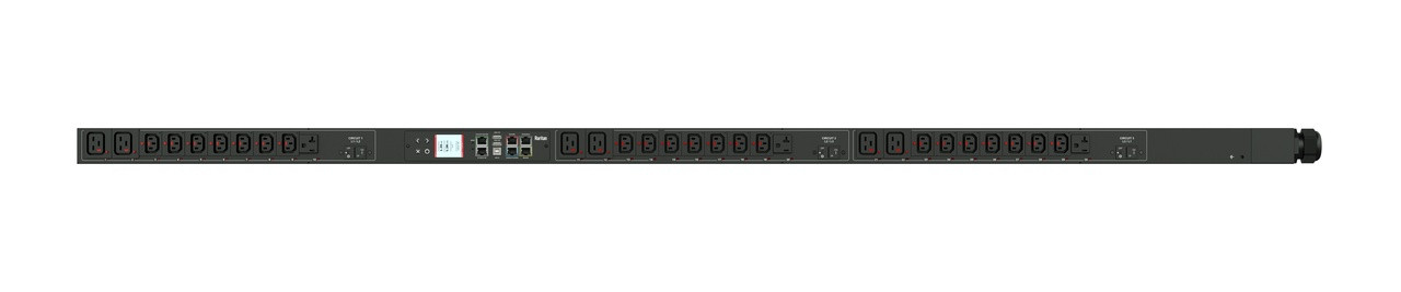Monitored and switched rack power distribution unit (0U [vertical], 5.8kVA, 30 outlets). INPUT: 208v (3-phase WYE), 20a - NEMA L21-20P plug (4P5W); OUTPUT: 21@ C13 Locking, 6@ C19 Locking outlets; on 3@ 2-pole, 20a Overcurrent Protectors; FEATURES: Billing-Grade (+/- 1%) Energy Metering [kW, kVA, V, A, Power Factor] - per inlet, per breaker/fuse, per outlet; Remote network monitoring via HTML, JSON-RPC, SSH, Telnet, MODBUS/TCP, and SNMPv3. Onboard embedded processor with minimum 536MHz clock speed, 16MB SPI Flash, and 64MB DDR2 RAM. Cascading upto 16 PDU's using single Ethernet or USB connection. Environmental monitoring [temp/humidity] capable – up to 32 sensors. Individual outlet numbers labeled on chassis. Automated deployment via TFTP, DHCP, SSH(CLI), or USB Flash Drives. WiFi Capable. USB Webcam Capable. iPad/iPhone/Android App. Dual 10/100/1000 Ethernet port. Tri-color status LED per receptacle. Breaker metering and alarming (0V detection). Max Dimensions 52mm x 71mm x 1780mm (2.1in x 2.8in x 70.1in). Max Weight TBD. Maximum ambient temperature 60C at full load.