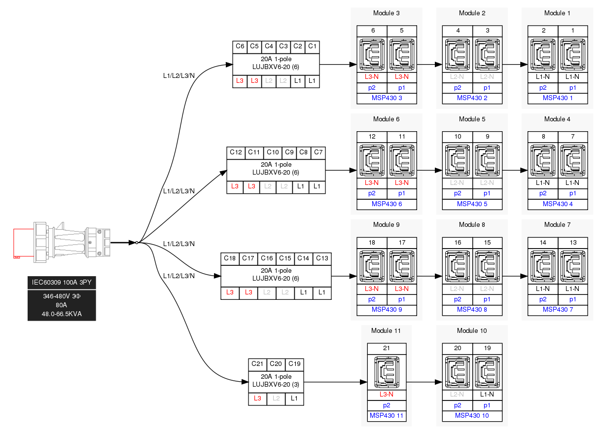 3PH, 480V AC, 100A (80A/PH rated); 21 outlets: SDG 300; plug: IEC 60309 3P+N+E 7h 100A (Wye Bottom-front feed), 66.5kVA; Outlet Metered/Switched, Zero U