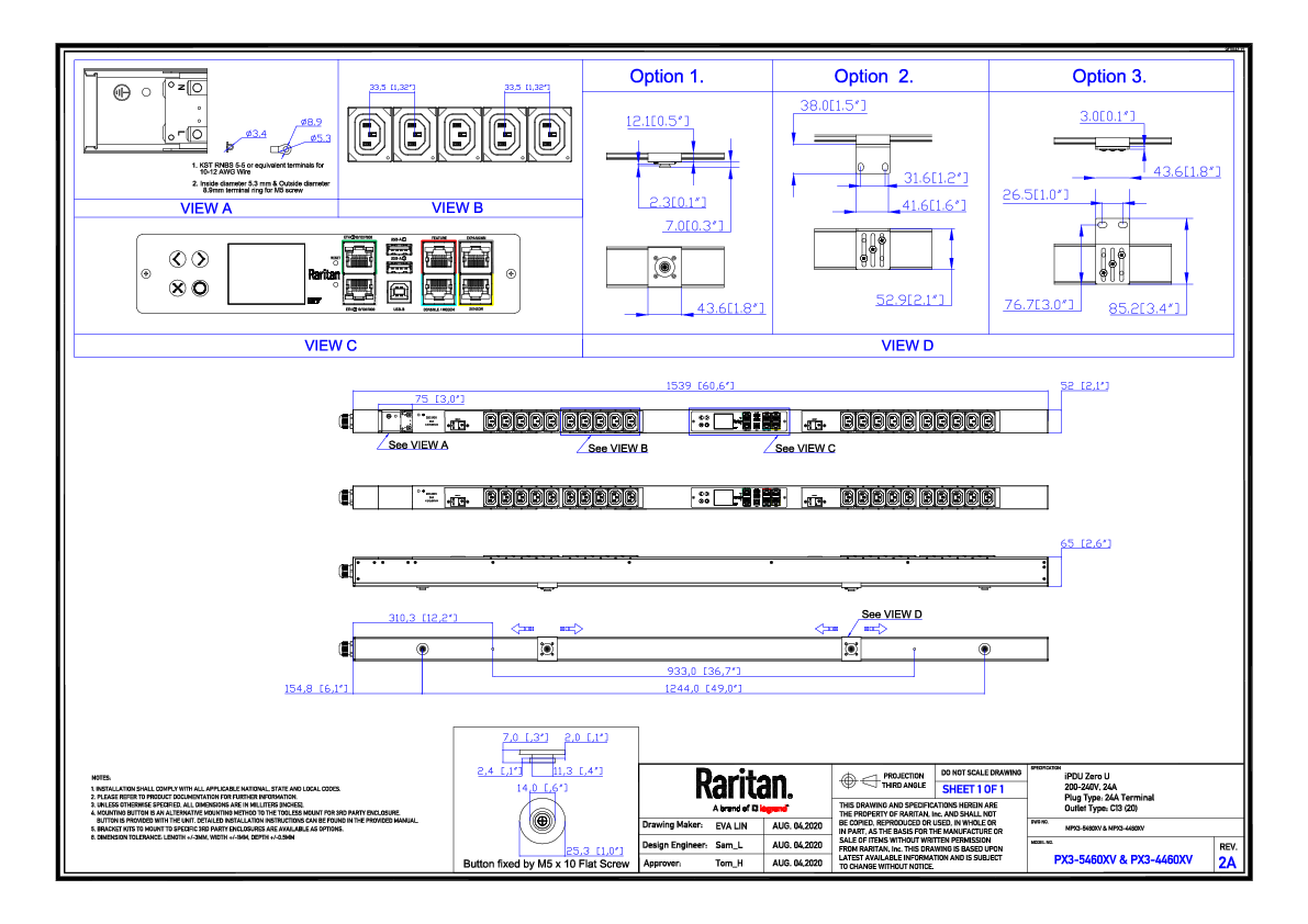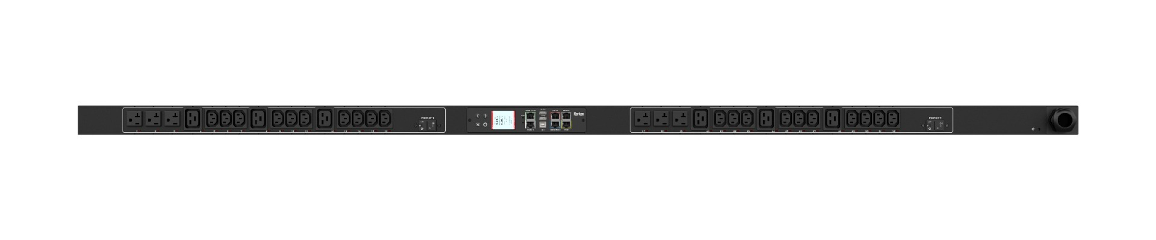 1PH, 208V AC, 24A; 20 outlets: 20x C13; plug: 24A Terminal (Bottom-bottom feed), 5.0kVA; Outlet Metered/Switched, Zero U vertical PDU, SecureLock ready, high resolution color display with field replaceable controller, Ethernet, serial, 2x USB-A, USB-B and sensor connections