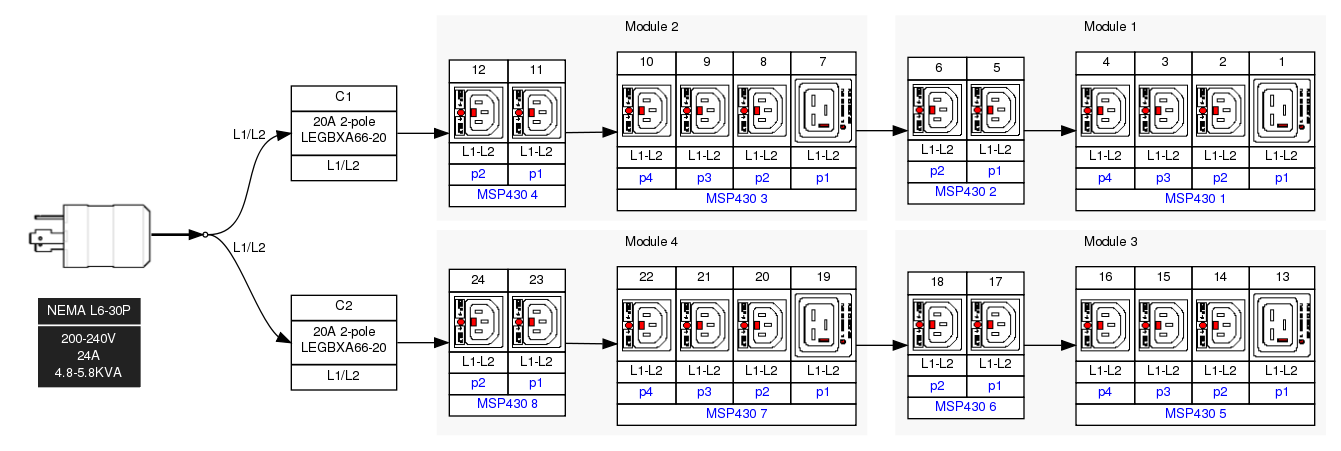 The PX3-5497V-E2 (MPN: PX3-5497V-E2) operates on single-phase 208V power with a 30A input current rating (24A operational rating). The unit features a NEMA L6-30P locking plug with bottom-bottom feed configuration for flexible installation options. The outlet configuration includes 20 locking C13 outlets and 4 locking C19 outlets, accommodating a wide range of IT equipment power requirements.