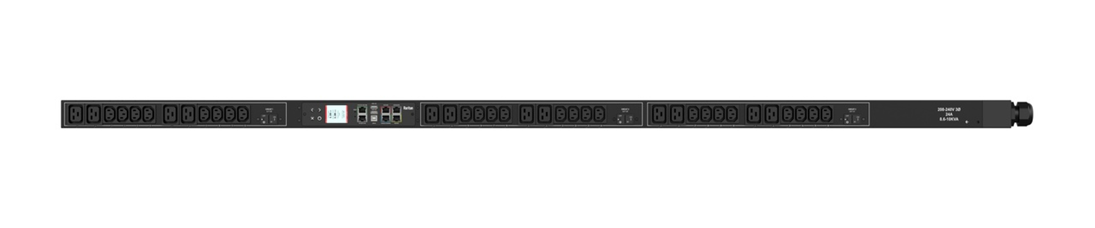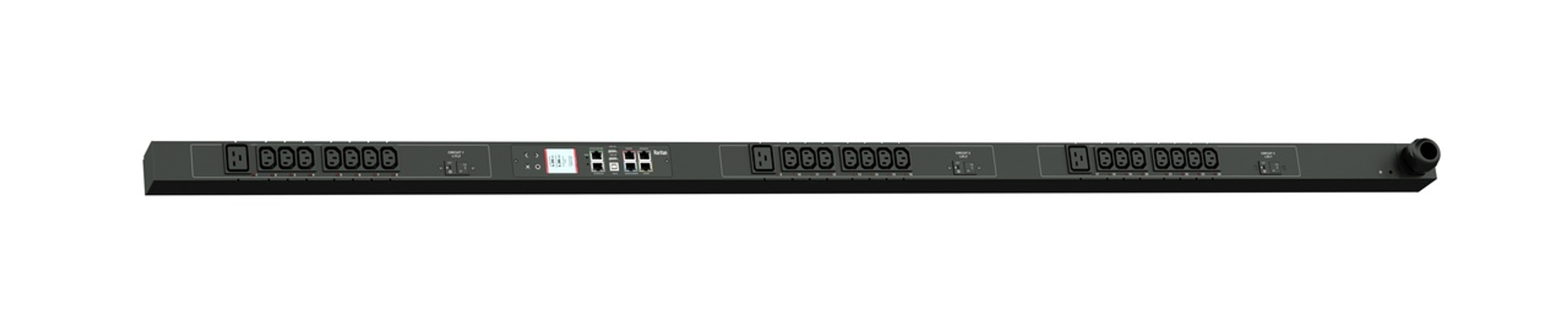 Monitored and switched rack power distribution unit (0U [vertical], 8.6kVA, 24 outlets). INPUT: 208v (3-phase DELTA), 30a - NEMA L21-30P plug (4P5W); OUTPUT: 21@ C13, 3@ C19 outlets; on 3@ 2-pole, 20a Overcurrent Protectors; FEATURES: Billing-Grade (+/- 1%) Energy Metering [kW, kVA, V, A, Power Factor] - per inlet, per breaker/fuse, per outlet; Remote network monitoring via HTML, JSON-RPC, SSH, Telnet, MODBUS/TCP, and SNMPv3. Onboard embedded processor with minimum 536MHz clock speed, 16MB SPI Flash, and 64MB DDR2 RAM. Cascading upto 16 PDU's using single Ethernet or USB connection. Environmental monitoring [temp/humidity] capable – up to 32 sensors. Individual outlet numbers labeled on chassis. Automated deployment via TFTP, DHCP, SSH(CLI), or USB Flash Drives. WiFi Capable. USB Webcam Capable. iPad/iPhone/Android App. Dual 10/100/1000 Ethernet port. Tri-color status LED per receptacle. Breaker metering and alarming (0V detection). Max Dimensions 52mm x 65mm x 1780mm (2.1in x 2.6in x 70.1in). Max Weight 6.3 kg. Maximum ambient temperature 60C at full load.