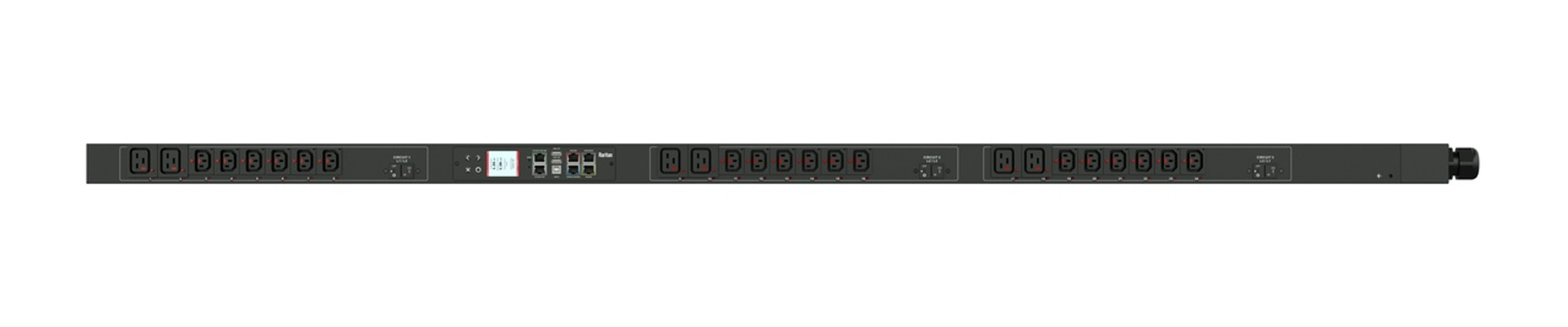 Monitored and switched rack power distribution unit (0U [vertical], 8.6kVA, 24 outlets). INPUT: 208v (3-phase DELTA), 30a - NEMA L15-30P plug (3P4W); OUTPUT: 18@ C13 Locking, 6@ C19 Locking outlets; on 3@ 2-pole, 20a Overcurrent Protectors; FEATURES: Billing-Grade (+/- 1%) Energy Metering [kW, kVA, V, A, Power Factor] - per inlet, per breaker/fuse, per outlet; Remote network monitoring via HTML, JSON-RPC, SSH, Telnet, MODBUS/TCP, and SNMPv3. Onboard embedded processor with minimum 536MHz clock speed, 16MB SPI Flash, and 64MB DDR2 RAM. Cascading upto 16 PDU's using single Ethernet or USB connection. Environmental monitoring [temp/humidity] capable – up to 32 sensors. Individual outlet numbers labeled on chassis. Automated deployment via TFTP, DHCP, SSH(CLI), or USB Flash Drives. WiFi Capable. USB Webcam Capable. iPad/iPhone/Android App. Dual 10/100/1000 Ethernet port. Tri-color status LED per receptacle. Breaker metering and alarming (0V detection). Max Dimensions 52mm x 71mm x 1780mm (2.1in x 2.8in x 70.1in). Max Weight 6.8 kg. Maximum ambient temperature 60C at full load.