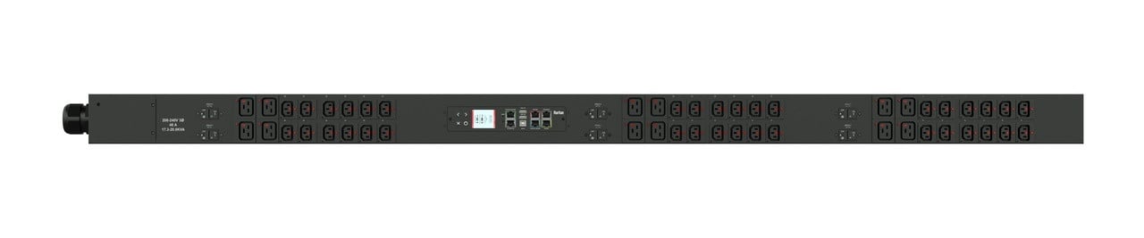 Monitored and switched rack power distribution unit (0U [vertical], 17.3kVA, 24 outlets). INPUT: 208v (3-phase DELTA), 60a - IEC 60309 3P+E 9h 60A plug (3P4W); OUTPUT: 18@ C13 Locking, 6@ C19 Locking outlets; on 6@ 2-pole, 20a Overcurrent Protectors; FEATURES: Billing-Grade (+/- 1%) Energy Metering [kW, kVA, V, A, Power Factor] - per inlet, per breaker/fuse, per outlet; Remote network monitoring via HTML, JSON-RPC, SSH, Telnet, MODBUS/TCP, and SNMPv3. Onboard embedded processor with minimum 536MHz clock speed, 16MB SPI Flash, and 64MB DDR2 RAM. Cascading upto 16 PDU's using single Ethernet or USB connection. Environmental monitoring [temp/humidity] capable – up to 32 sensors. Individual outlet numbers labeled on chassis. Automated deployment via TFTP, DHCP, SSH(CLI), or USB Flash Drives. WiFi Capable. USB Webcam Capable. iPad/iPhone/Android App. Dual 10/100/1000 Ethernet port. Tri-color status LED per receptacle. Breaker metering and alarming (0V detection). Max Dimensions 59mm x 80mm x 1780mm (2.3in x 3.2in x 70.1in). Max Weight 12.9 kg. Maximum ambient temperature 60C at full load.