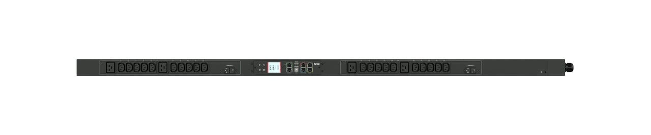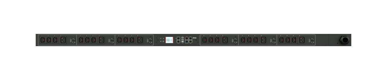 Monitored and switched rack power distribution unit (0U [vertical], 14.4kVA, 24 outlets). INPUT: 208v (3-phase DELTA), 50a - CS8365C plug (3P4W); OUTPUT: 18@ C13 Locking, 6@ C19 Locking outlets; on 6@ 2-pole, 20a Overcurrent Protectors; FEATURES: Billing-Grade (+/- 1%) Energy Metering [kW, kVA, V, A, Power Factor] - per inlet, per breaker/fuse, per outlet; Remote network monitoring via HTML, JSON-RPC, SSH, Telnet, MODBUS/TCP, and SNMPv3. Onboard embedded processor with minimum 536MHz clock speed, 16MB SPI Flash, and 64MB DDR2 RAM. Cascading upto 16 PDU's using single Ethernet or USB connection. Environmental monitoring [temp/humidity] capable – up to 32 sensors. Individual outlet numbers labeled on chassis. Automated deployment via TFTP, DHCP, SSH(CLI), or USB Flash Drives. WiFi Capable. USB Webcam Capable. iPad/iPhone/Android App. Dual 10/100/1000 Ethernet port. Tri-color status LED per receptacle. Breaker metering and alarming (0V detection). Max Dimensions 65mm x 71mm x 1676mm (2.6in x 2.8in x 66.0in). Max Weight TBD. Maximum ambient temperature 60C at full load.