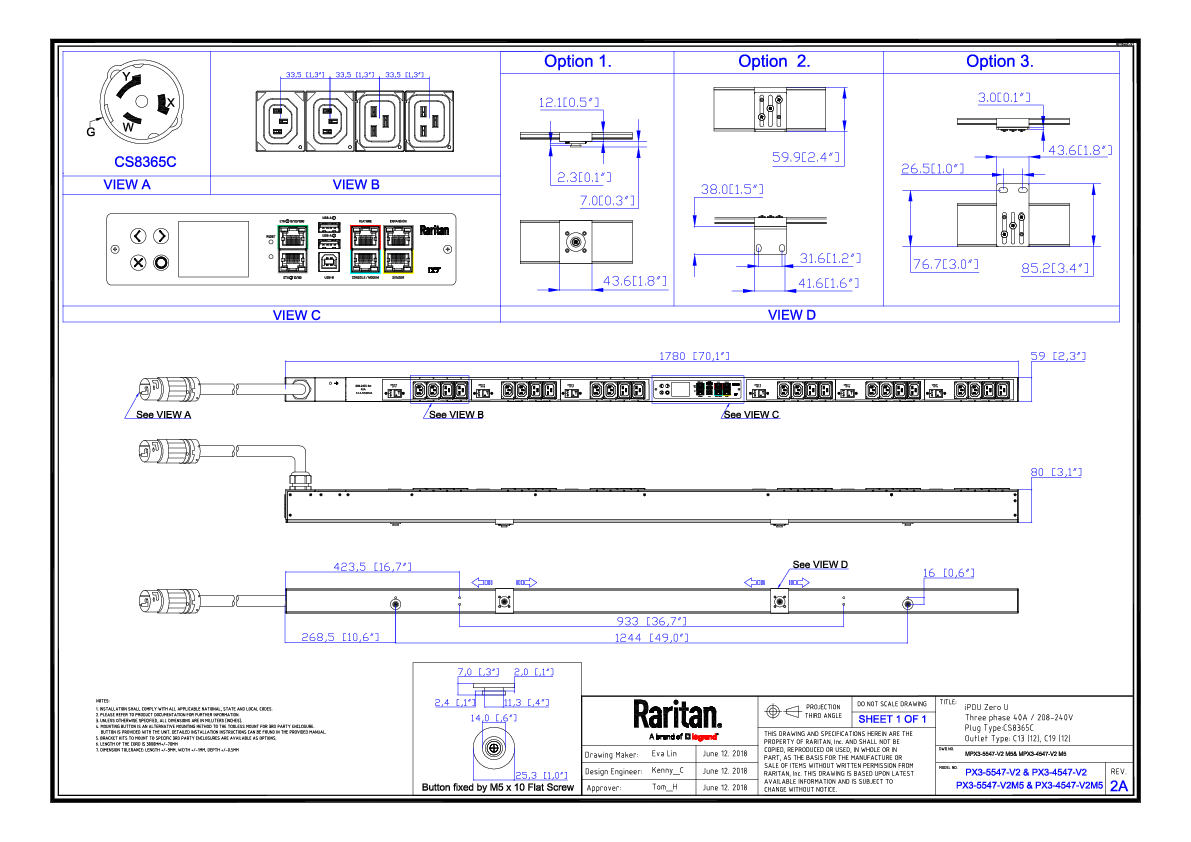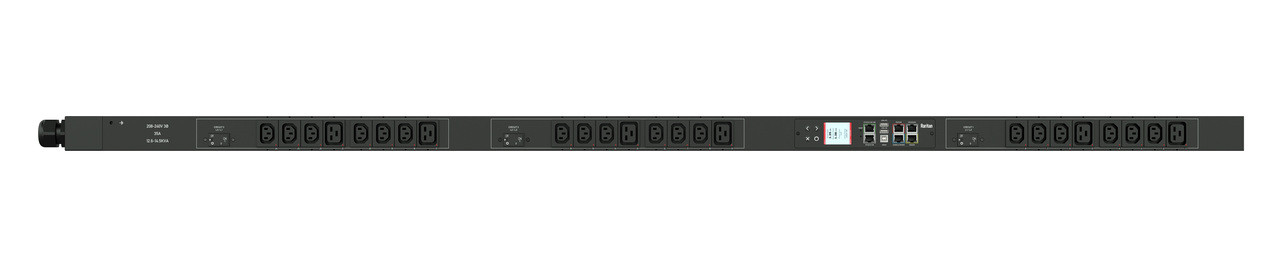 3PH, 208V AC, 50A (40A/PH rated); 24 outlets: 12x C13, 12x C19; plug: Hubbell CS8365C (Delta Bottom-front feed), 14.4kVA; Outlet Metered/Switched, Zero U vertical PDU, SecureLock ready, V2 Outlet Sequence, high resolution color display with field replaceable controller, Ethernet, serial, 2x USB-A, USB-B and sensor connections