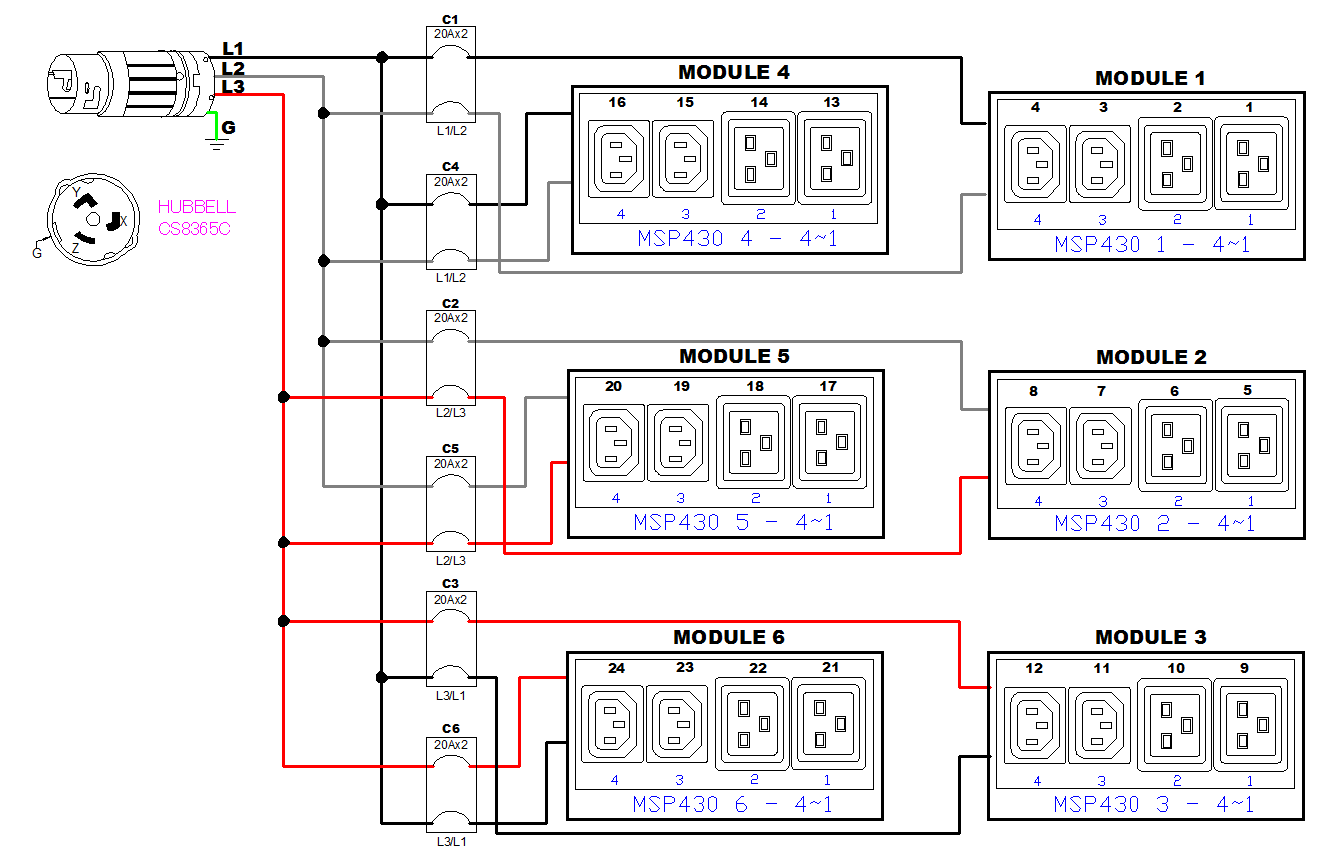 3PH, 208V AC, 50A (40A/PH rated); 24 outlets: 12x C13, 12x C19; plug: Hubbell CS8365C (Delta Bottom-front feed), 14.4kVA; Outlet Metered/Switched, Zero U vertical PDU