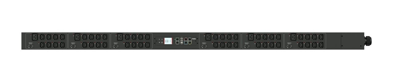 Monitored and switched rack power distribution unit (0U [vertical], 17.3kVA, 24 outlets). INPUT: 208v (3-phase DELTA), 60a - IEC 60309 3P+E 9h 60A plug (3P4W); OUTPUT: 12@ C13, 12@ C19 outlets; on 6@ 2-pole, 20a Overcurrent Protectors; FEATURES: Billing-Grade (+/- 1%) Energy Metering [kW, kVA, V, A, Power Factor] - per inlet, per breaker/fuse, per outlet; Remote network monitoring via HTML, JSON-RPC, SSH, Telnet, MODBUS/TCP, and SNMPv3. Onboard embedded processor with minimum 536MHz clock speed, 16MB SPI Flash, and 64MB DDR2 RAM. Cascading upto 16 PDU's using single Ethernet or USB connection. Environmental monitoring [temp/humidity] capable – up to 32 sensors. Individual outlet numbers labeled on chassis. Automated deployment via TFTP, DHCP, SSH(CLI), or USB Flash Drives. WiFi Capable. USB Webcam Capable. iPad/iPhone/Android App. Dual 10/100/1000 Ethernet port. Tri-color status LED per receptacle. Breaker metering and alarming (0V detection). Max Dimensions 59mm x 80mm x 1780mm (2.3in x 3.2in x 70.1in). Max Weight TBD. Maximum ambient temperature 60C at full load.
