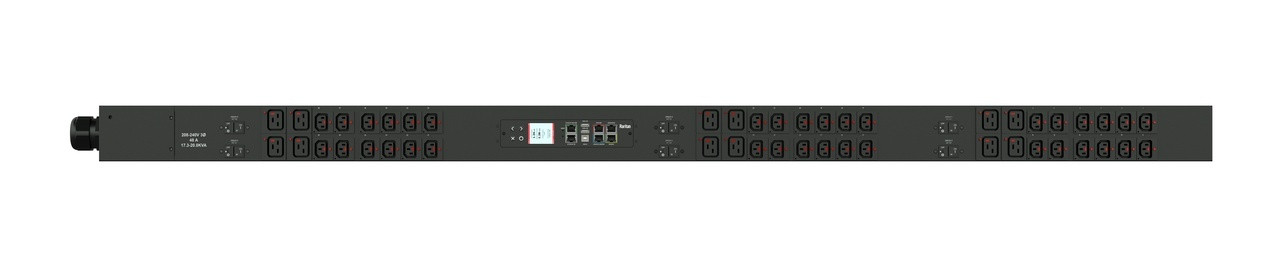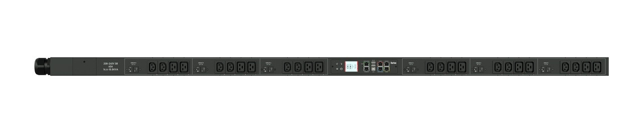 Monitored and switched rack power distribution unit (0U [vertical], 17.3kVA, 24 outlets). INPUT: 208v (3-phase DELTA), 60a - IEC 60309 3P+E 9h 60A plug (3P4W); OUTPUT: 12@ C13, 12@ C19 outlets; on 6@ 2-pole, 20a Overcurrent Protectors; FEATURES: Billing-Grade (+/- 1%) Energy Metering [kW, kVA, V, A, Power Factor] - per inlet, per breaker/fuse, per outlet; Remote network monitoring via HTML, JSON-RPC, SSH, Telnet, MODBUS/TCP, and SNMPv3. Onboard embedded processor with minimum 536MHz clock speed, 16MB SPI Flash, and 64MB DDR2 RAM. Cascading upto 16 PDU's using single Ethernet or USB connection. Environmental monitoring [temp/humidity] capable – up to 32 sensors. Individual outlet numbers labeled on chassis. Automated deployment via TFTP, DHCP, SSH(CLI), or USB Flash Drives. WiFi Capable. USB Webcam Capable. iPad/iPhone/Android App. Dual 10/100/1000 Ethernet port. Tri-color status LED per receptacle. Breaker metering and alarming (0V detection). Max Dimensions 59mm x 80mm x 1780mm (2.3in x 3.2in x 70.1in). Max Weight TBD. Maximum ambient temperature 60C at full load.