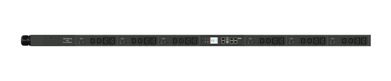 Monitored and switched rack power distribution unit (0U [vertical], 17.3kVA, 24 outlets). INPUT: 208v (3-phase DELTA), 60a - IEC 60309 3P+E 9h 60A plug (3P4W); OUTPUT: 12@ C13, 12@ C19 outlets; on 6@ 2-pole, 20a Overcurrent Protectors; FEATURES: Billing-Grade (+/- 1%) Energy Metering [kW, kVA, V, A, Power Factor] - per inlet, per breaker/fuse, per outlet; Remote network monitoring via HTML, JSON-RPC, SSH, Telnet, MODBUS/TCP, and SNMPv3. Onboard embedded processor with minimum 536MHz clock speed, 16MB SPI Flash, and 64MB DDR2 RAM. Cascading upto 16 PDU's using single Ethernet or USB connection. Environmental monitoring [temp/humidity] capable – up to 32 sensors. Individual outlet numbers labeled on chassis. Automated deployment via TFTP, DHCP, SSH(CLI), or USB Flash Drives. WiFi Capable. USB Webcam Capable. iPad/iPhone/Android App. Dual 10/100/1000 Ethernet port. Tri-color status LED per receptacle. Breaker metering and alarming (0V detection). Max Dimensions 59mm x 80mm x 1780mm (2.3in x 3.2in x 70.1in). Max Weight TBD. Maximum ambient temperature 60C at full load.