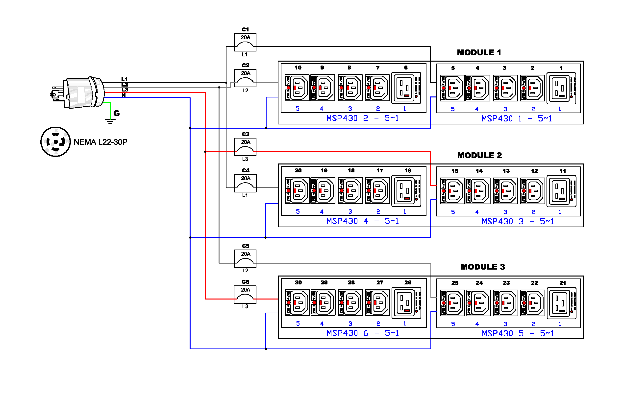 3PH, 415V AC, 30A (24A/PH rated); 30 outlets: 24x Locking C13, 6x Locking C19; plug: NEMA L22-30P (Wye Top-top feed)