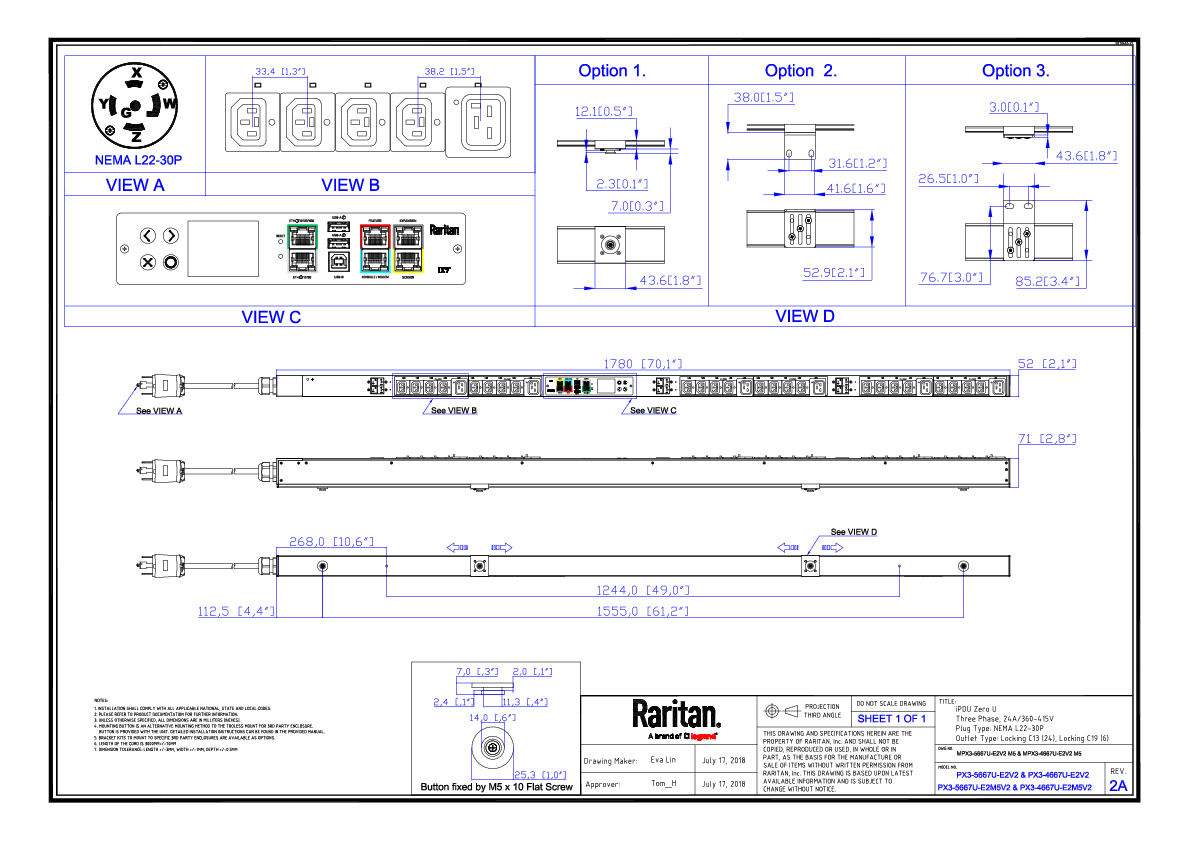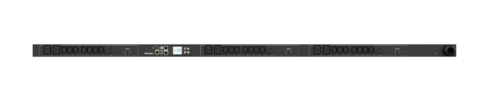 Monitored and switched rack power distribution unit (0U [vertical], 16.6kVA, 30 outlets). INPUT: 400v (3-phase WYE), 30a - NEMA L22-30P plug (4P5W); OUTPUT: 24@ C13 Locking, 6@ C19 Locking outlets; on 6@ 1-pole, 20a Overcurrent Protectors; FEATURES: Billing-Grade (+/- 1%) Energy Metering [kW, kVA, V, A, Power Factor] - per inlet, per breaker/fuse, per outlet; Remote network monitoring via HTML, JSON-RPC, SSH, Telnet, MODBUS/TCP, and SNMPv3. Onboard embedded processor with minimum 536MHz clock speed, 16MB SPI Flash, and 64MB DDR2 RAM. Cascading upto 16 PDU's using single Ethernet or USB connection. Environmental monitoring [temp/humidity] capable – up to 32 sensors. Individual outlet numbers labeled on chassis. Automated deployment via TFTP, DHCP, SSH(CLI), or USB Flash Drives. WiFi Capable. USB Webcam Capable. iPad/iPhone/Android App. Dual 10/100/1000 Ethernet port. Tri-color status LED per receptacle. Breaker metering and alarming (0V detection). Max Dimensions 52mm x 71mm x 1780mm (2.1in x 2.8in x 70.1in). Max Weight TBD. Maximum ambient temperature 60C at full load.