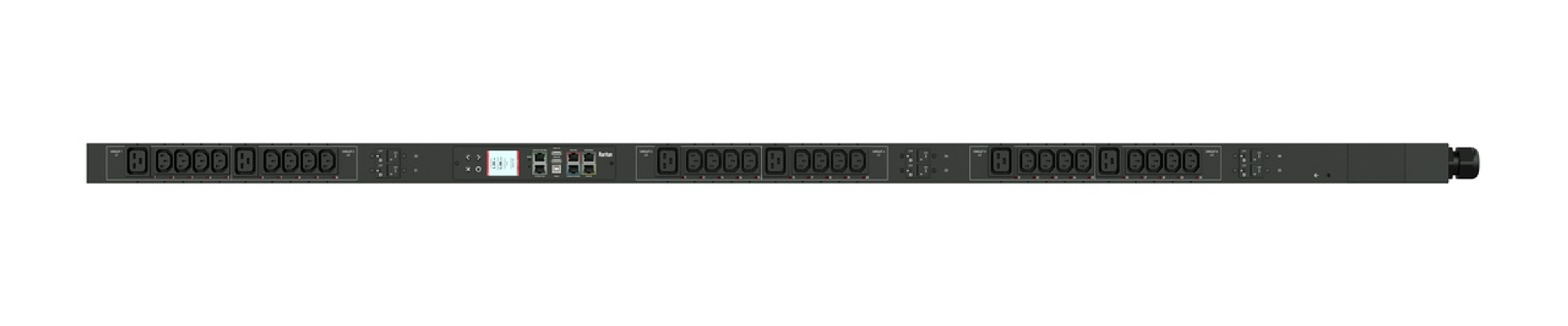 Monitored and switched rack power distribution unit (0U [vertical], 22.2kVA, 30 outlets). INPUT: 400v (3-phase WYE), 32a - IEC 60309 3P+N+E 6h 32A plug (4P5W); OUTPUT: 24@ C13, 6@ C19 outlets; on 6@ 1-pole, 16a Overcurrent Protectors; FEATURES: Billing-Grade (+/- 1%) Energy Metering [kW, kVA, V, A, Power Factor] - per inlet, per breaker/fuse, per outlet; Remote network monitoring via HTML, JSON-RPC, SSH, Telnet, MODBUS/TCP, and SNMPv3. Onboard embedded processor with minimum 536MHz clock speed, 16MB SPI Flash, and 64MB DDR2 RAM. Cascading upto 16 PDU's using single Ethernet or USB connection. Environmental monitoring [temp/humidity] capable – up to 32 sensors. Individual outlet numbers labeled on chassis. Automated deployment via TFTP, DHCP, SSH(CLI), or USB Flash Drives. WiFi Capable. USB Webcam Capable. iPad/iPhone/Android App. Dual 10/100/1000 Ethernet port. Tri-color status LED per receptacle. Breaker metering and alarming (0V detection). Max Dimensions 52mm x 65mm x 1780mm (2.1in x 2.6in x 70.1in). Max Weight TBD. Maximum ambient temperature 60C at full load.