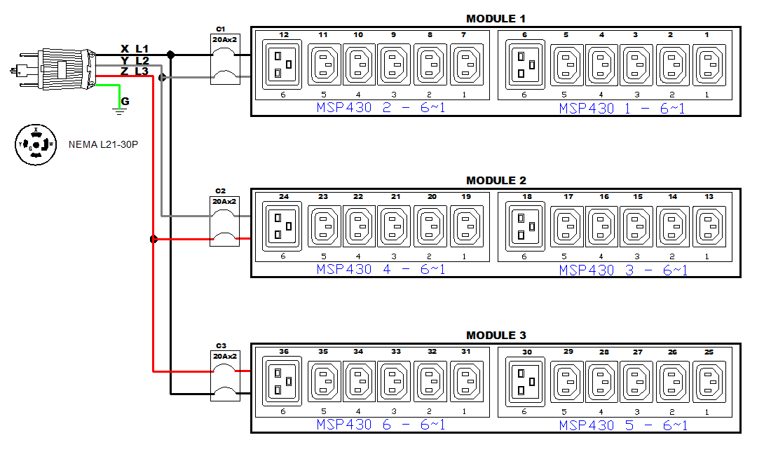 3PH, 208V AC, 30A (24A/PH rated); 36 outlets: 30x C13, 6x C19; plug: NEMA L21-30P (Wye Bottom-bottom feed)