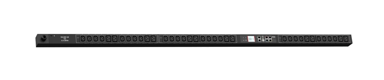Monitored and switched rack power distribution unit (0U [vertical], 5.8kVA, 36 outlets). INPUT: 208v (3-phase DELTA), 20a - NEMA L21-20P plug (4P5W); OUTPUT: 24@ C13, 12@ C19 outlets; FEATURES: Billing-Grade (+/- 1%) Energy Metering [kW, kVA, V, A, Power Factor] - per inlet, per outlet; Remote network monitoring via HTML, JSON-RPC, SSH, Telnet, MODBUS/TCP, and SNMPv3. Onboard embedded processor with minimum 536MHz clock speed, 16MB SPI Flash, and 64MB DDR2 RAM. Cascading upto 16 PDU's using single Ethernet or USB connection. Environmental monitoring [temp/humidity] capable – up to 32 sensors. Individual outlet numbers labeled on chassis. Automated deployment via TFTP, DHCP, SSH(CLI), or USB Flash Drives. WiFi Capable. USB Webcam Capable. iPad/iPhone/Android App. Dual 10/100/1000 Ethernet port. Tri-color status LED per receptacle. Max Dimensions 52mm x 65mm x 1780mm (2.1in x 2.6in x 70.1in). Max Weight 6 kg. Maximum ambient temperature 60C at full load.
