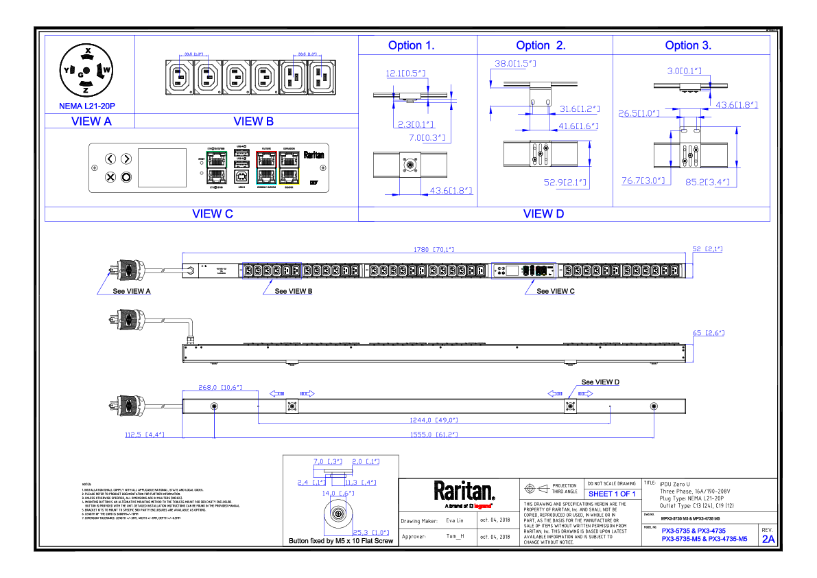 3PH, 208V AC, 20A (16A/PH rated); 36 outlets: 24x C13, 12x C19; plug: NEMA L21-20P (Wye Bottom-front feed)