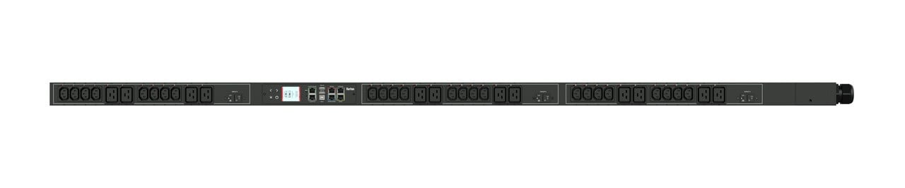 Monitored and switched rack power distribution unit (0U [vertical], 10kVA, 36 outlets). INPUT: 208v, 60a - IEC 60309 2P+E 6h 60A plug (2P3W); OUTPUT: 24@ C13, 12@ C19 outlets; on 3@ 2-pole, 20a Overcurrent Protectors; FEATURES: Billing-Grade (+/- 1%) Energy Metering [kW, kVA, V, A, Power Factor] - per inlet, per breaker/fuse, per outlet; Remote network monitoring via HTML, JSON-RPC, SSH, Telnet, MODBUS/TCP, and SNMPv3. Onboard embedded processor with minimum 536MHz clock speed, 16MB SPI Flash, and 64MB DDR2 RAM. Cascading upto 16 PDU's using single Ethernet or USB connection. Environmental monitoring [temp/humidity] capable – up to 32 sensors. Individual outlet numbers labeled on chassis. Automated deployment via TFTP, DHCP, SSH(CLI), or USB Flash Drives. WiFi Capable. USB Webcam Capable. iPad/iPhone/Android App. Dual 10/100/1000 Ethernet port. Tri-color status LED per receptacle. Breaker metering and alarming (0V detection). Max Dimensions 52mm x 65mm x 1780mm (2.1in x 2.6in x 70.1in). Max Weight TBD. Maximum ambient temperature 60C at full load.