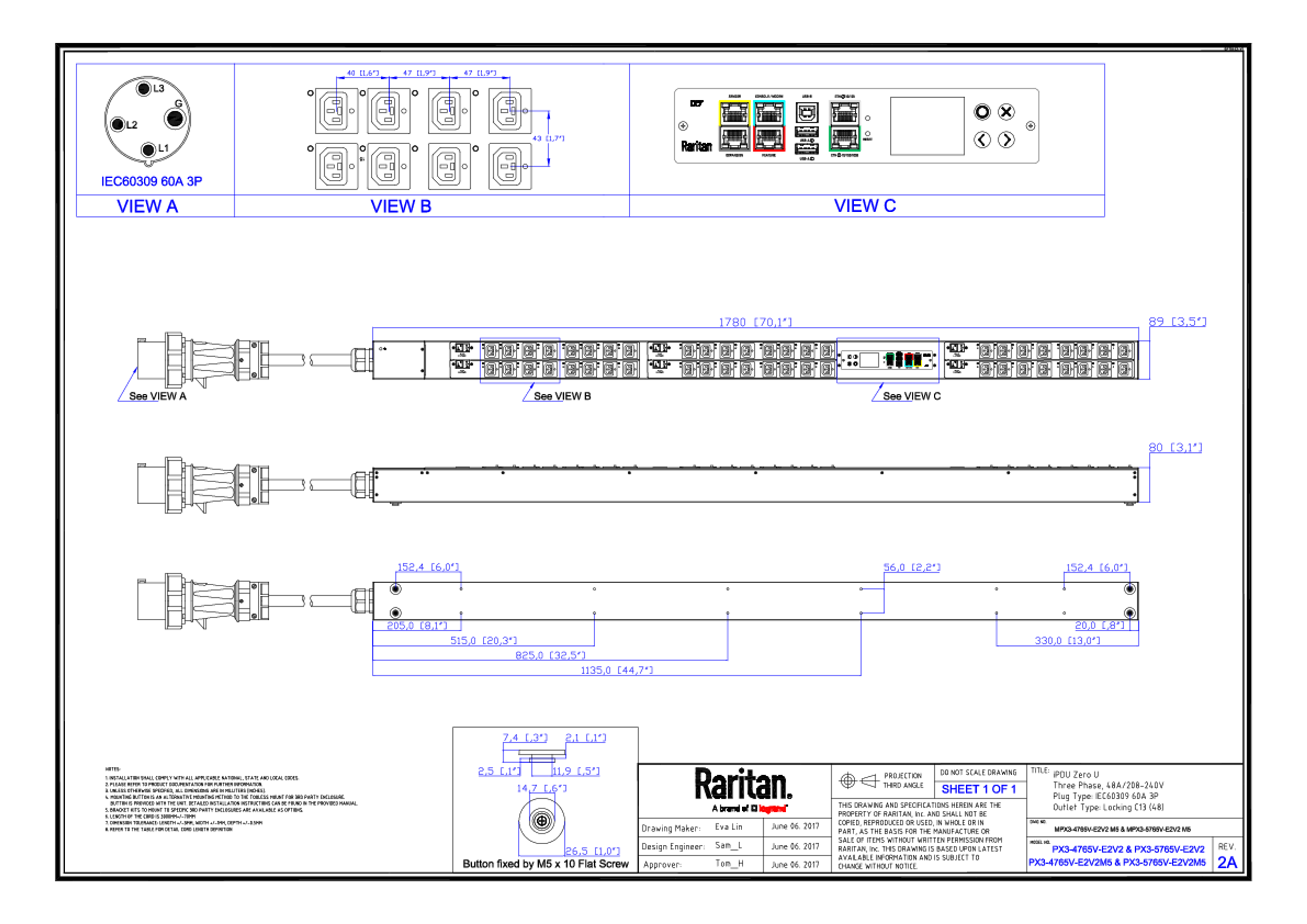 Raritan PX3-5765V-E2V2 3PH 208V AC 60A 48 outlets Zero U PDU