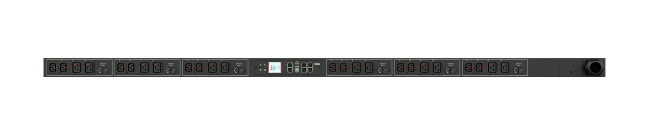 Monitored and switched rack power distribution unit (0U [vertical], 17.3kVA, 48 outlets). INPUT: 208v (3-phase DELTA), 60a - IEC 60309 3P+E 9h 60A plug (3P4W); OUTPUT: 48@ C13 Locking outlets; on 6@ 2-pole, 20a Overcurrent Protectors; FEATURES: Billing-Grade (+/- 1%) Energy Metering [kW, kVA, V, A, Power Factor] - per inlet, per breaker/fuse, per outlet; Remote network monitoring via HTML, JSON-RPC, SSH, Telnet, MODBUS/TCP, and SNMPv3. Onboard embedded processor with minimum 536MHz clock speed, 16MB SPI Flash, and 64MB DDR2 RAM. Cascading upto 16 PDU's using single Ethernet or USB connection. Environmental monitoring [temp/humidity] capable – up to 32 sensors. Individual outlet numbers labeled on chassis. Automated deployment via TFTP, DHCP, SSH(CLI), or USB Flash Drives. WiFi Capable. USB Webcam Capable. iPad/iPhone/Android App. Dual 10/100/1000 Ethernet port. Tri-color status LED per receptacle. Breaker metering and alarming (0V detection). Max Dimensions 89mm x 80mm x 1780mm (3.5in x 3.1in x 70.1in). Max Weight 15 kg. Maximum ambient temperature 60C at full load.