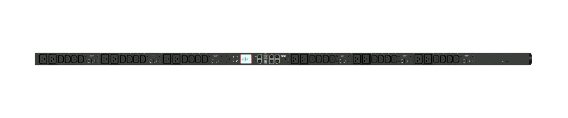 Monitored and switched rack power distribution unit (0U [vertical], 17.3kVA, 54 outlets). INPUT: 208v (3-phase DELTA), 60a - IEC 60309 3P+E 9h 60A plug (3P4W); OUTPUT: 48@ C13, 6@ C19 outlets; on 6@ 2-pole, 20a Overcurrent Protectors; FEATURES: Billing-Grade (+/- 1%) Energy Metering [kW, kVA, V, A, Power Factor] - per inlet, per breaker/fuse, per outlet; Remote network monitoring via HTML, JSON-RPC, SSH, Telnet, MODBUS/TCP, and SNMPv3. Onboard embedded processor with minimum 536MHz clock speed, 16MB SPI Flash, and 64MB DDR2 RAM. Cascading upto 16 PDU's using single Ethernet or USB connection. Environmental monitoring [temp/humidity] capable – up to 32 sensors. Individual outlet numbers labeled on chassis. Automated deployment via TFTP, DHCP, SSH(CLI), or USB Flash Drives. WiFi Capable. USB Webcam Capable. iPad/iPhone/Android App. Dual 10/100/1000 Ethernet port. Tri-color status LED per receptacle. Breaker metering and alarming (0V detection). Max Dimensions 89mm x 80mm x 1780mm (3.5in x 3.1in x 70.1in). Max Weight 15 kg. Maximum ambient temperature 60C at full load.
