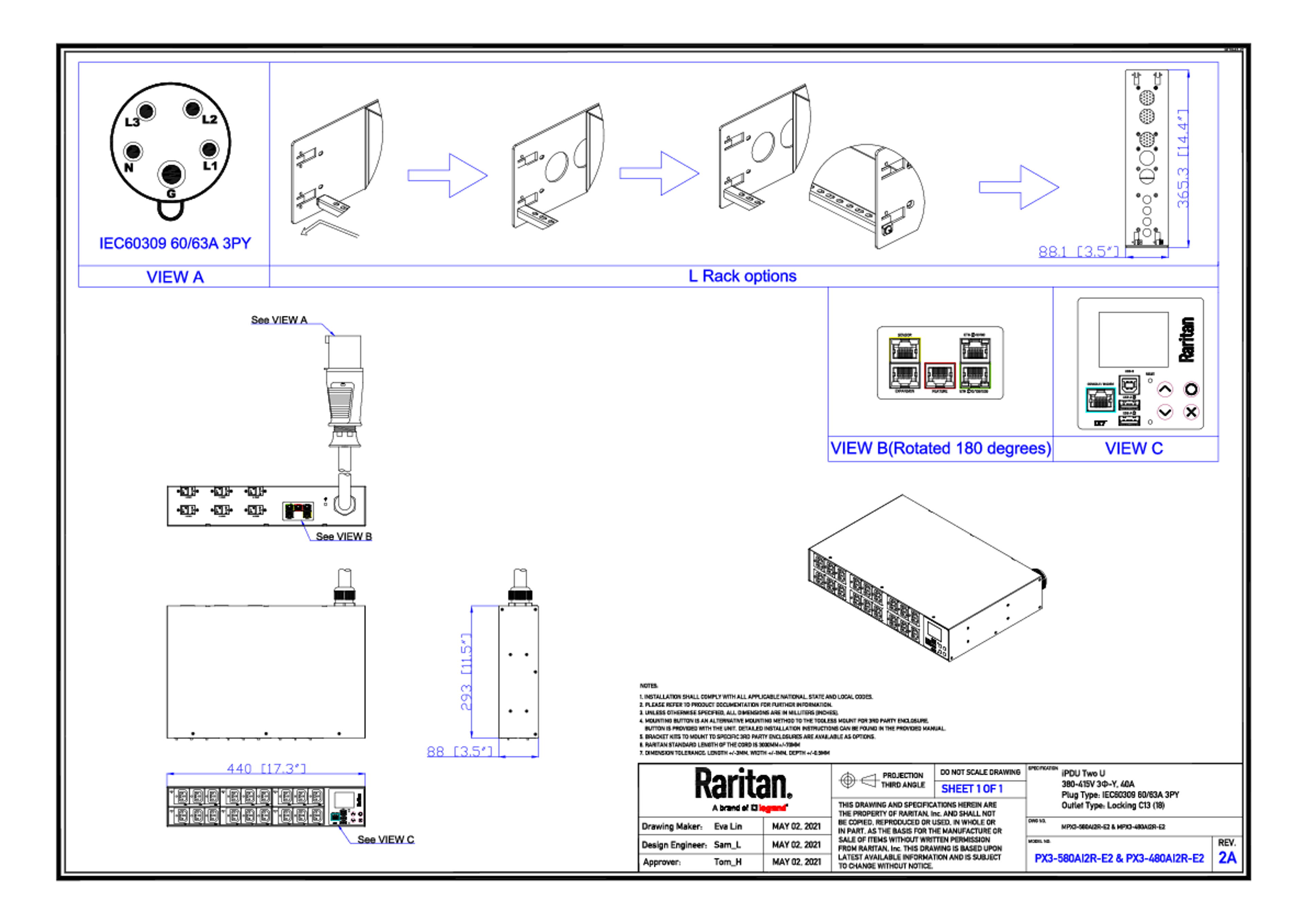3PH, 415V AC, 60A (40A/PH rated); 18 outlets: C13 Locking; plug: IEC 60309 3P+N+E 6h 60A , 28.8kVA; Outlet Metered/Switched, 2U PDU, SecureLock ready, V2 Outlet Sequence, high resolution color display with field replaceable controller, Ethernet, serial, 2x USB-A, USB-B and sensor connections