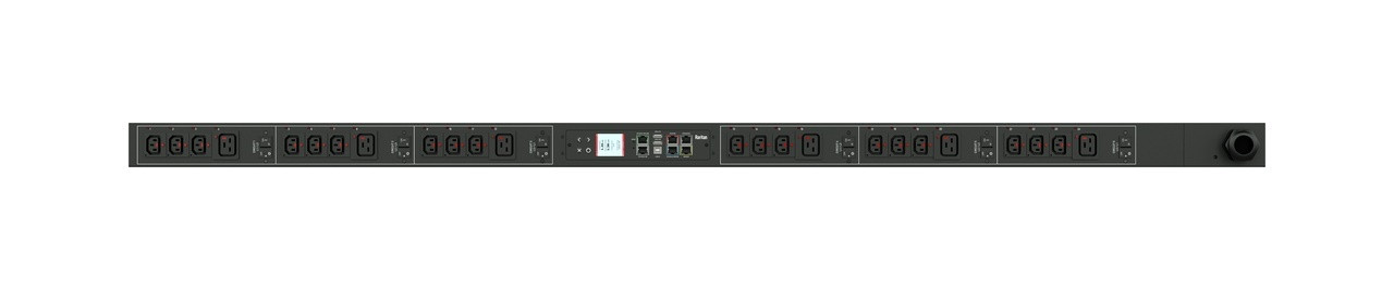 Monitored and switched rack power distribution unit (0U [vertical], 7.4kVA, 36 outlets). INPUT: 230v, 32a - IEC 60309 2P+E 6h 32A plug (2P3W); OUTPUT: 30@ C13, 6@ C19 outlets; on 2@ 1-pole, 16a Overcurrent Protectors; FEATURES: Billing-Grade (+/- 1%) Energy Metering [kW, kVA, V, A, Power Factor] - per inlet, per breaker/fuse, per outlet; Remote network monitoring via HTML, JSON-RPC, SSH, Telnet, MODBUS/TCP, and SNMPv3. Onboard embedded processor with minimum 536MHz clock speed, 16MB SPI Flash, and 64MB DDR2 RAM. Cascading upto 16 PDU's using single Ethernet or USB connection. Environmental monitoring [temp/humidity] capable – up to 32 sensors. Individual outlet numbers labeled on chassis. Automated deployment via TFTP, DHCP, SSH(CLI), or USB Flash Drives. WiFi Capable. USB Webcam Capable. iPad/iPhone/Android App. Dual 10/100/1000 Ethernet port. Tri-color status LED per receptacle. Breaker metering and alarming (0V detection). Max Dimensions 52mm x 65mm x 1780mm (2.1in x 2.6in x 70.1in). Max Weight 6.6 kg. Maximum ambient temperature 60C at full load.