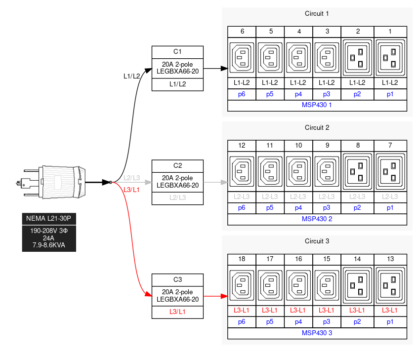 The PX3-5902 features a three-phase delta line-to-line input configuration with 208V AC power delivery through an NEMA L21-30P plug connection. The unit provides 18 total outlets consisting of 12 C13 outlets for standard server connections and 6 C19 outlets for higher-power equipment. The bottom-front feed design with Wye configuration ensures optimal power distribution across all three phases.