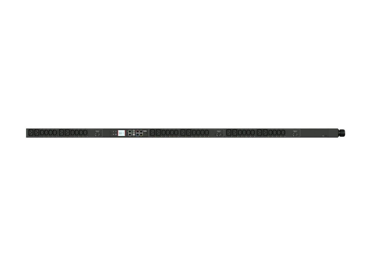 Monitored and switched rack power distribution unit (0U [vertical], 17.3kVA, 36 outlets). INPUT: 208v (3-phase DELTA), 60a - IEC 60309 3P+N+E 9h 60A plug (4P5W); OUTPUT: 24@ C13, 12@ C19 outlets; on 6@ 2-pole, 20a Overcurrent Protectors; FEATURES: Billing-Grade (+/- 1%) Energy Metering [kW, kVA, V, A, Power Factor] - per inlet, per breaker/fuse, per outlet; Remote network monitoring via HTML, JSON-RPC, SSH, Telnet, MODBUS/TCP, and SNMPv3. Onboard embedded processor with minimum 536MHz clock speed, 16MB SPI Flash, and 64MB DDR2 RAM. Cascading upto 16 PDU's using single Ethernet or USB connection. Environmental monitoring [temp/humidity] capable – up to 32 sensors. Individual outlet numbers labeled on chassis. Automated deployment via TFTP, DHCP, SSH(CLI), or USB Flash Drives. WiFi Capable. USB Webcam Capable. iPad/iPhone/Android App. Dual 10/100/1000 Ethernet port. Tri-color status LED per receptacle. Breaker metering and alarming (0V detection). Max Dimensions 59mm x 80mm x 1981mm (2.3in x 3.1in x 78.0in). Max Weight TBD. Maximum ambient temperature 60C at full load.