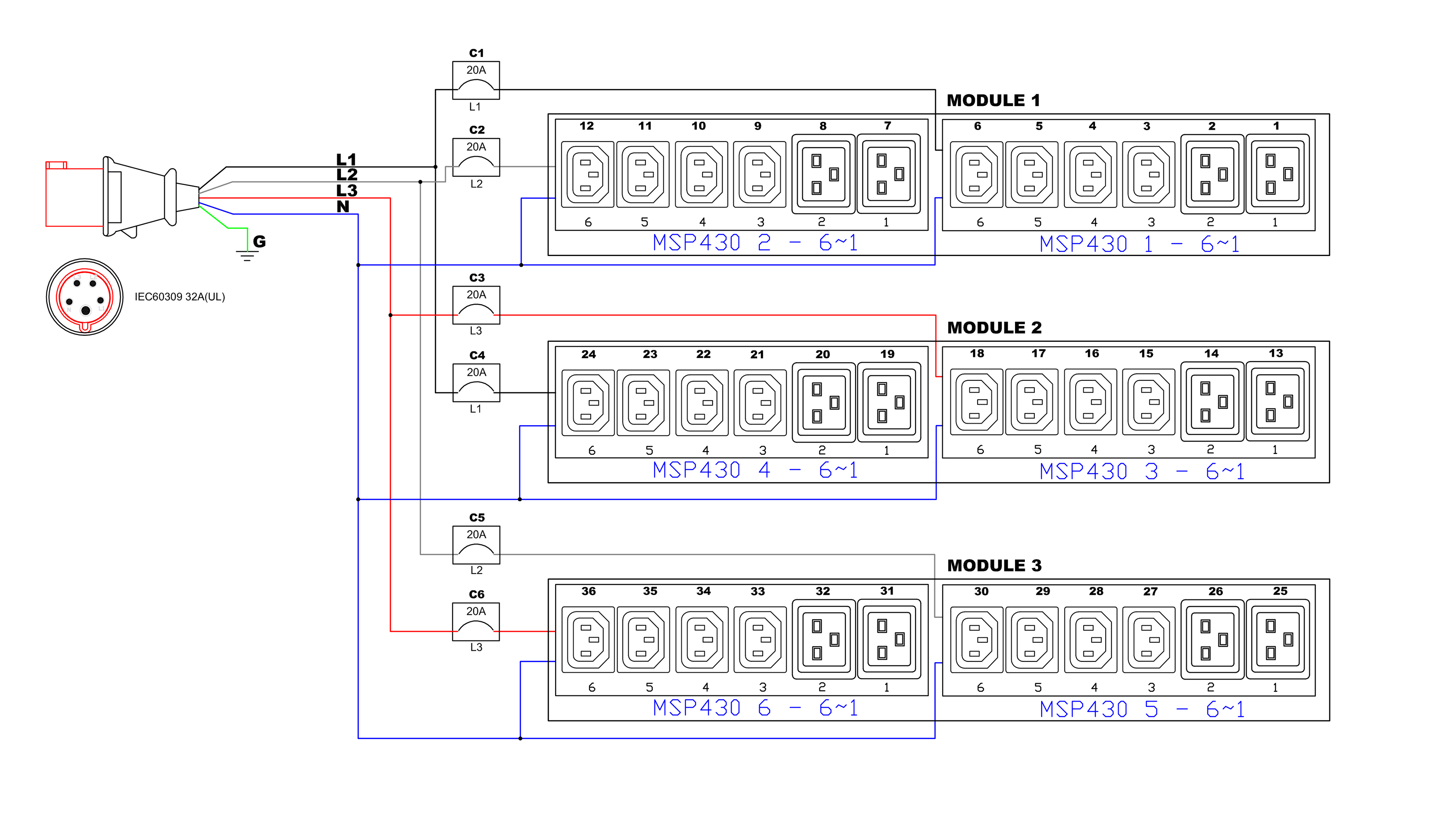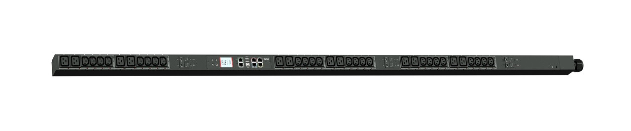 3PH, 400V AC, 32A (24A/PH rated); 36 outlets: 24x C13, 12x C19; plug: IEC 60309 3P+N+E 6h 32A (Wye Bottom-bottom feed), 16.6kVA; Outlet Metered, Zero U vertical PDU