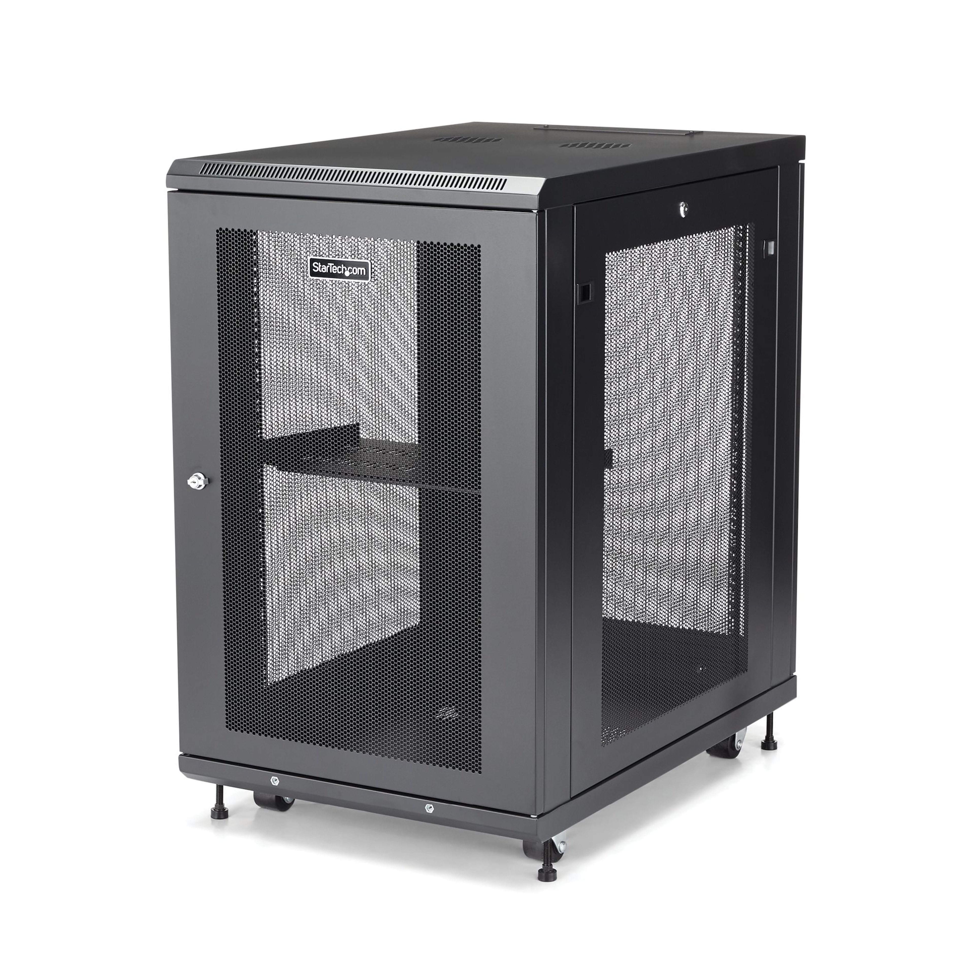 To ensure your equipment is running at an optimal temperature, the server rack/cabinet promotes passive cooling. It features mesh doors and vented top and bottom panels for maximum airflow.