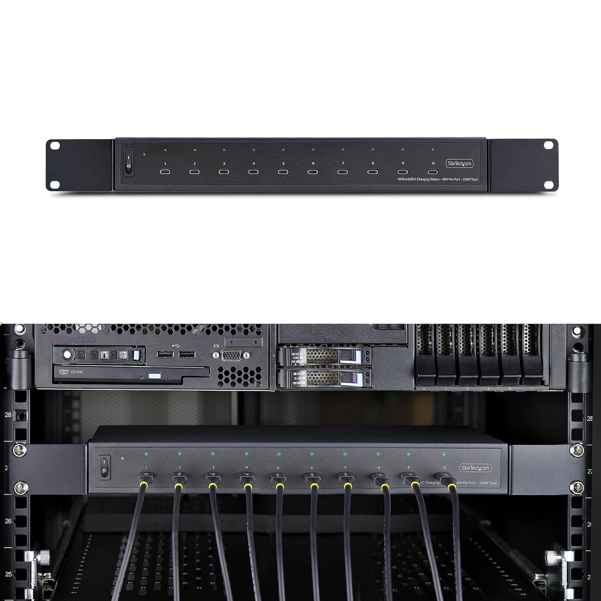 Charge up to 10 USB-C devices simultaneously with the StarTech.com 10N-CHARGING-STATION, a powerful 350W desktop or rackmount charging hub designed for offices, classrooms, and IT labs. Each port delivers up to 60W, dynamically adjusting power distribution to meet your devices' needs in real time.