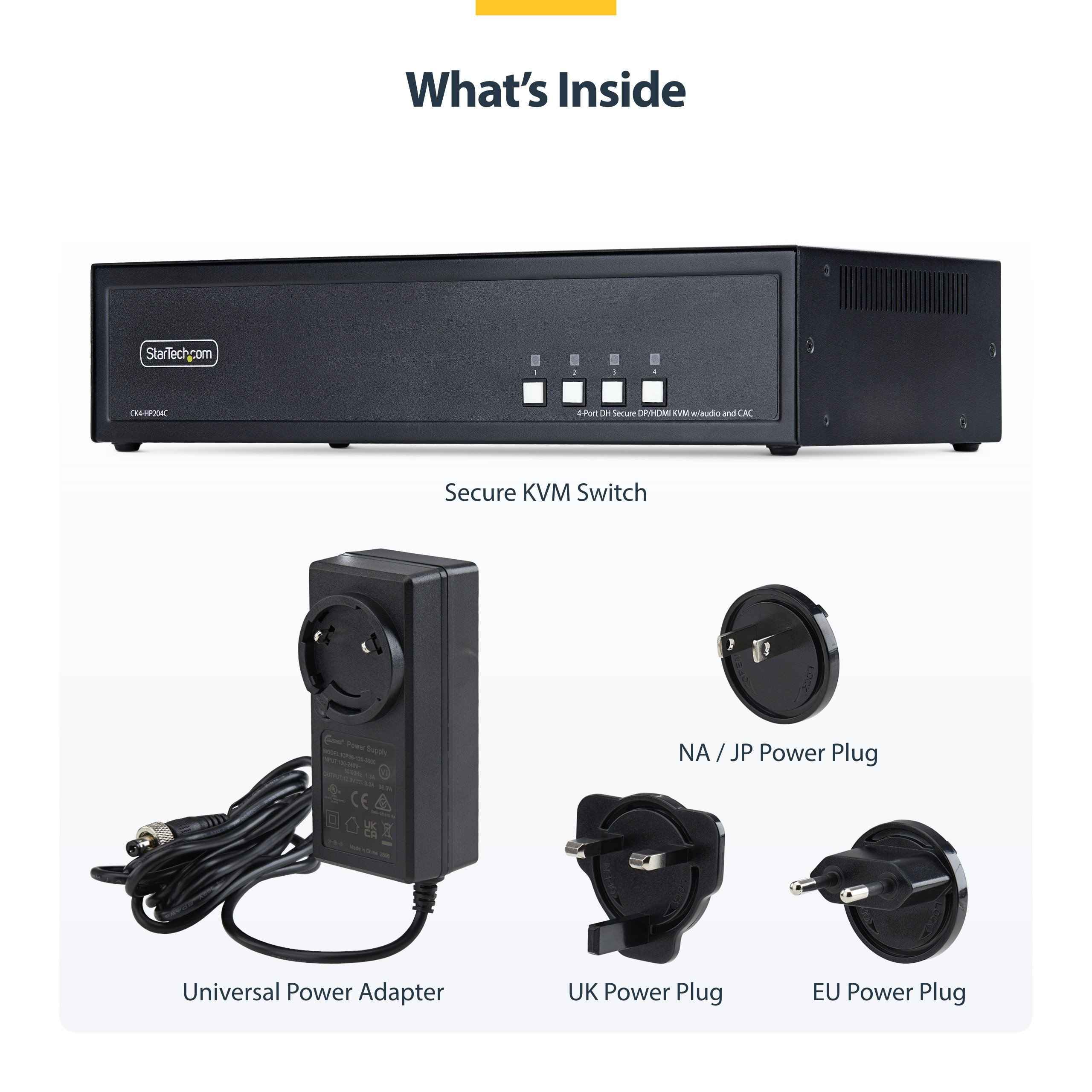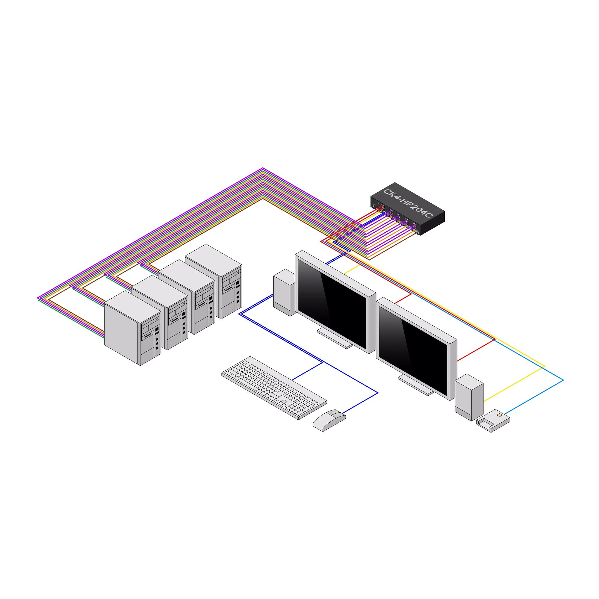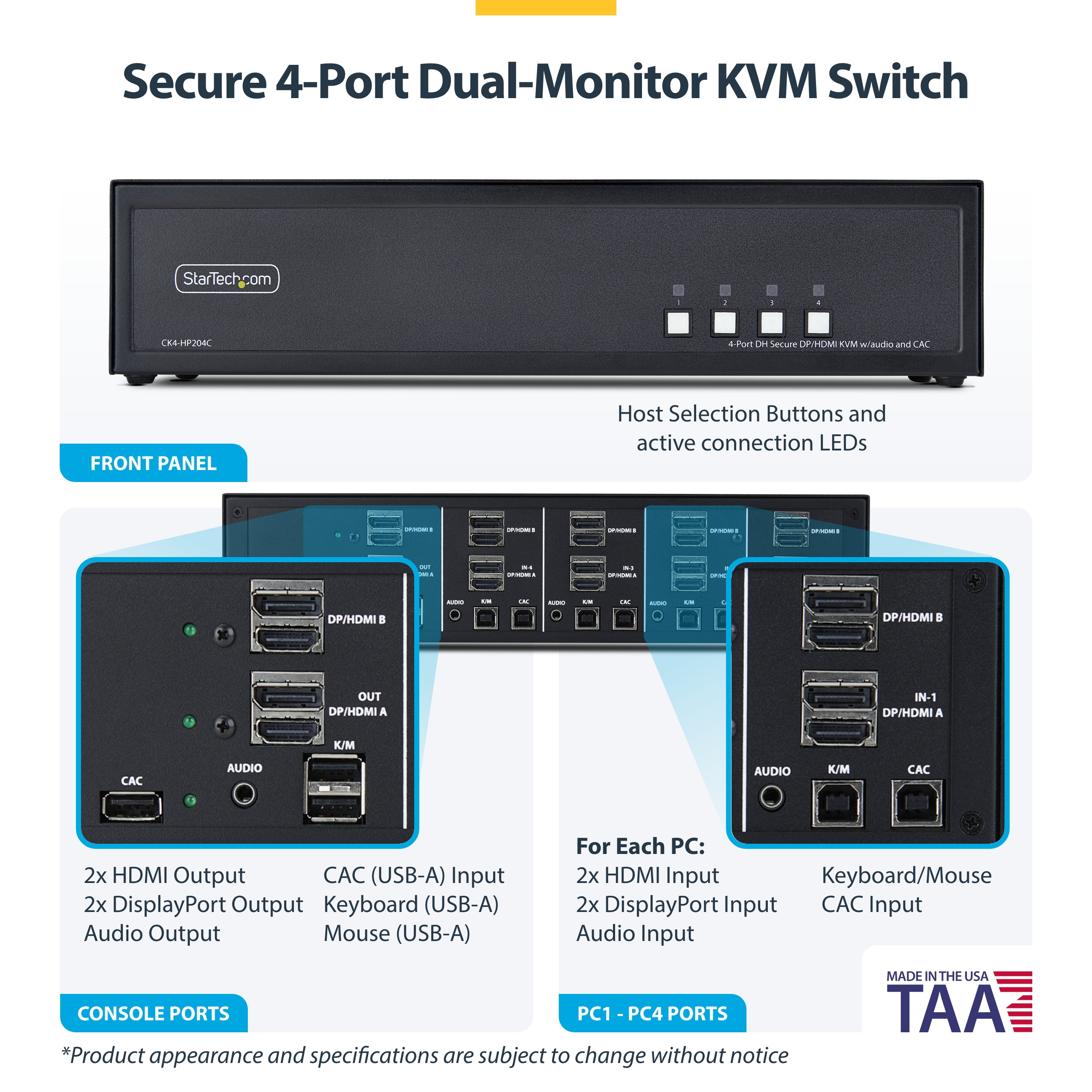 Control up to four HDMI or DisplayPort-enabled desktops, workstations, or servers from a single set of peripherals, including one mouse, one keyboard, and two 4K 60Hz monitors. The StarTech.com CK4-HP204C offers enterprise-grade performance combined with uncompromising security, making it ideal for managing sensitive or classified data across multiple systems.
