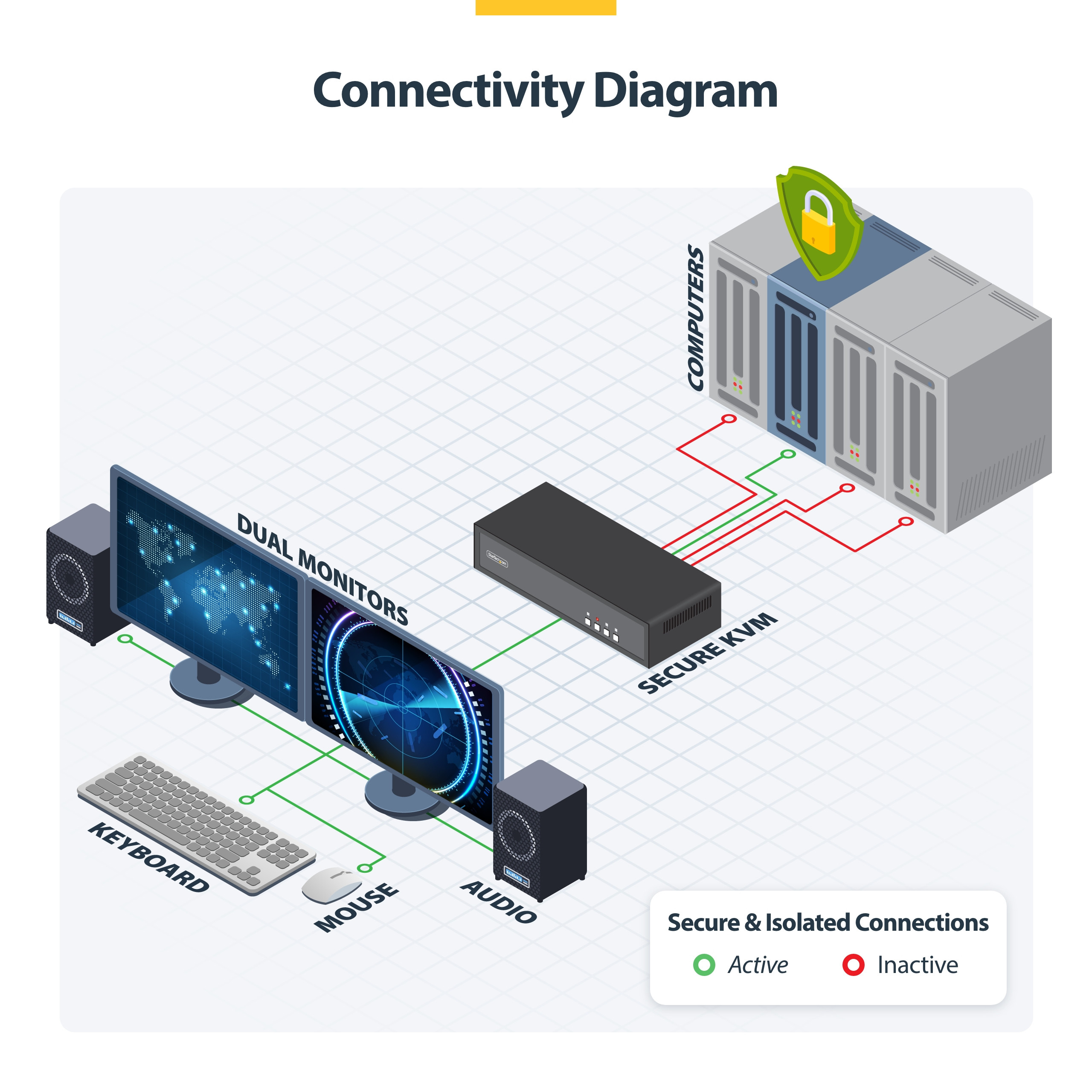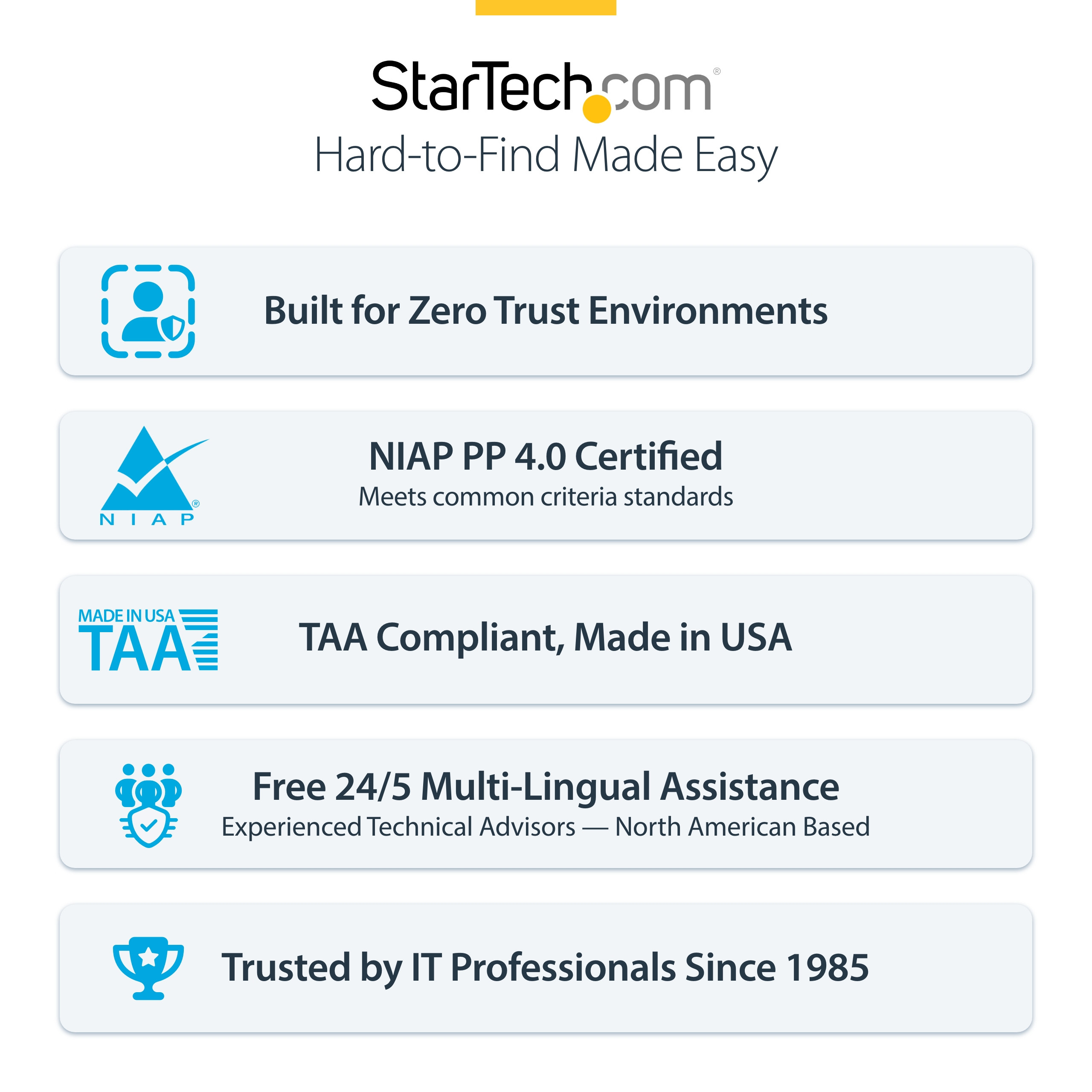 Control up to four DisplayPort-enabled computers from a single workstation with the StarTech.com CK4-P204, a NIAP certified KVM switch designed for high-security environments. This device offers enterprise-grade performance and uncompromising security by isolating data paths between connected systems, ensuring no data is ever stored or leaked.