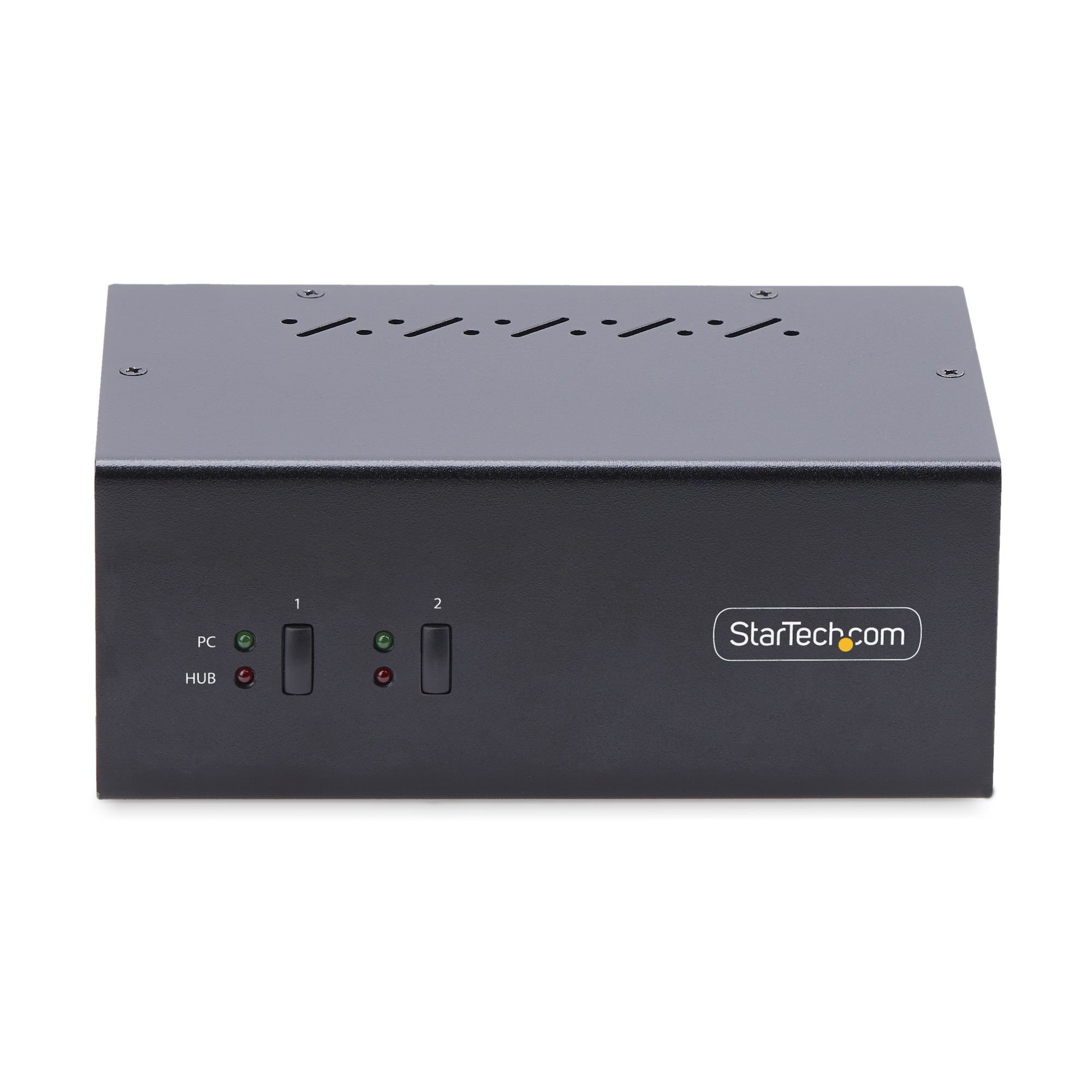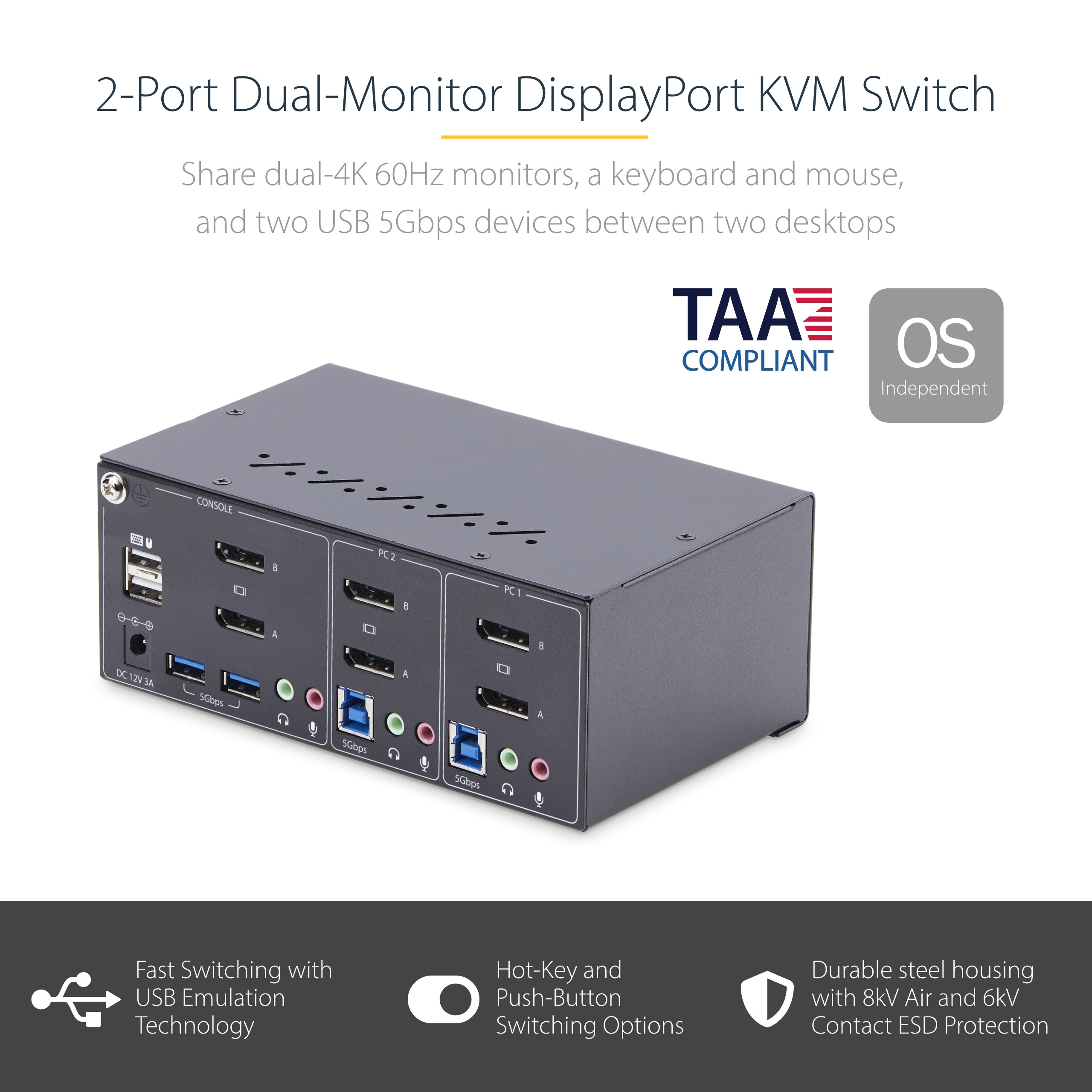 Enhance your productivity with the StarTech.com P2DD46A2-KVM-SWITCH, a versatile KVM switch designed to share a mouse, keyboard, USB hub, and dual 4K 60Hz DisplayPort displays between two DisplayPort-enabled computers. This TAA-compliant device is perfect for professionals in CAD/CAM, video editing, and content creation.