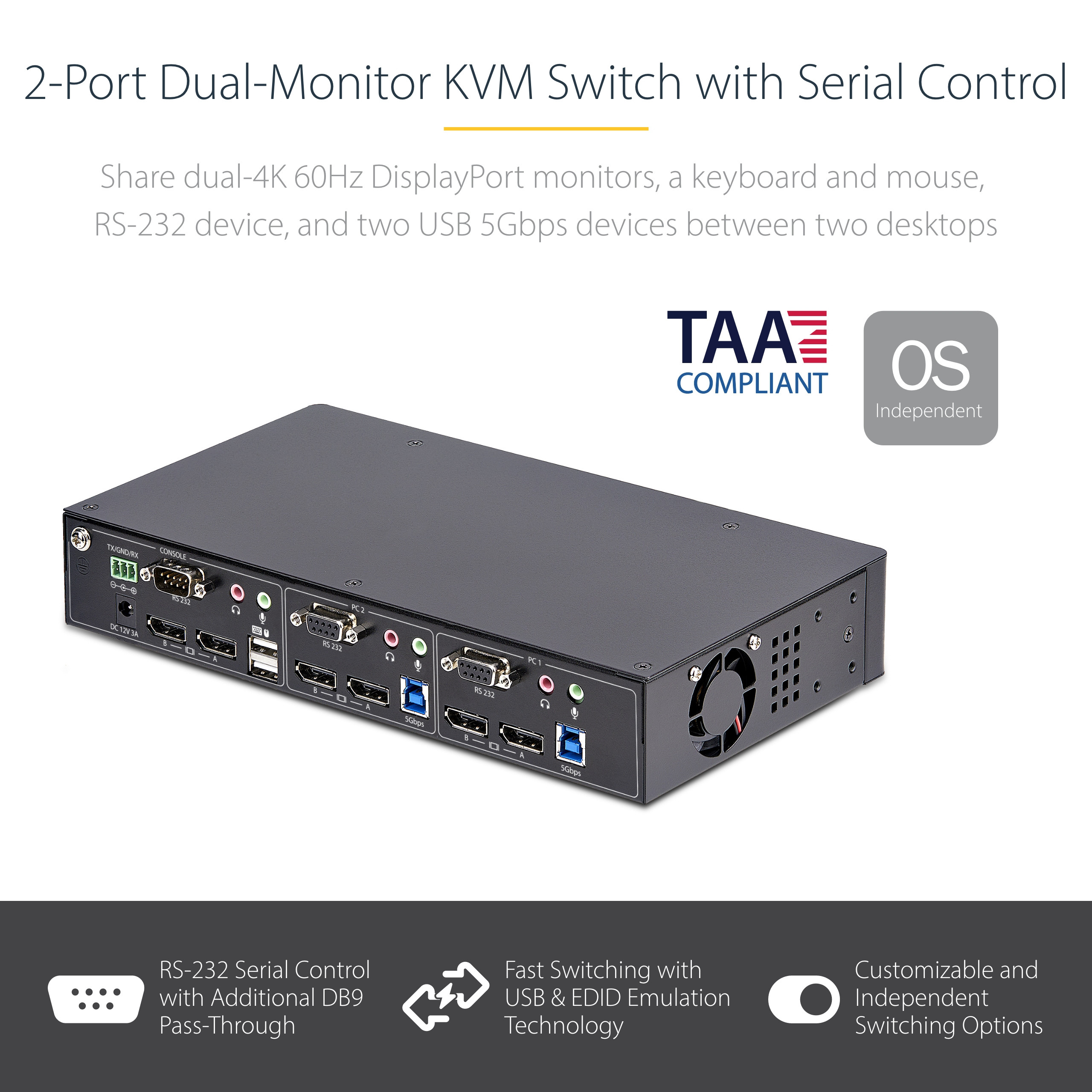Enhance your productivity with the StarTech.com P2DD46A22-KVM-SWITCH, a versatile KVM switch designed to share a mouse, keyboard, RS-232 device, and dual-4K 60Hz DisplayPort monitors between two DisplayPort-enabled desktops. This dual-monitor KVM switch allows seamless switching between two desktops, making it ideal for high-resolution applications such as CAD/CAM, video editing, and content creation.
