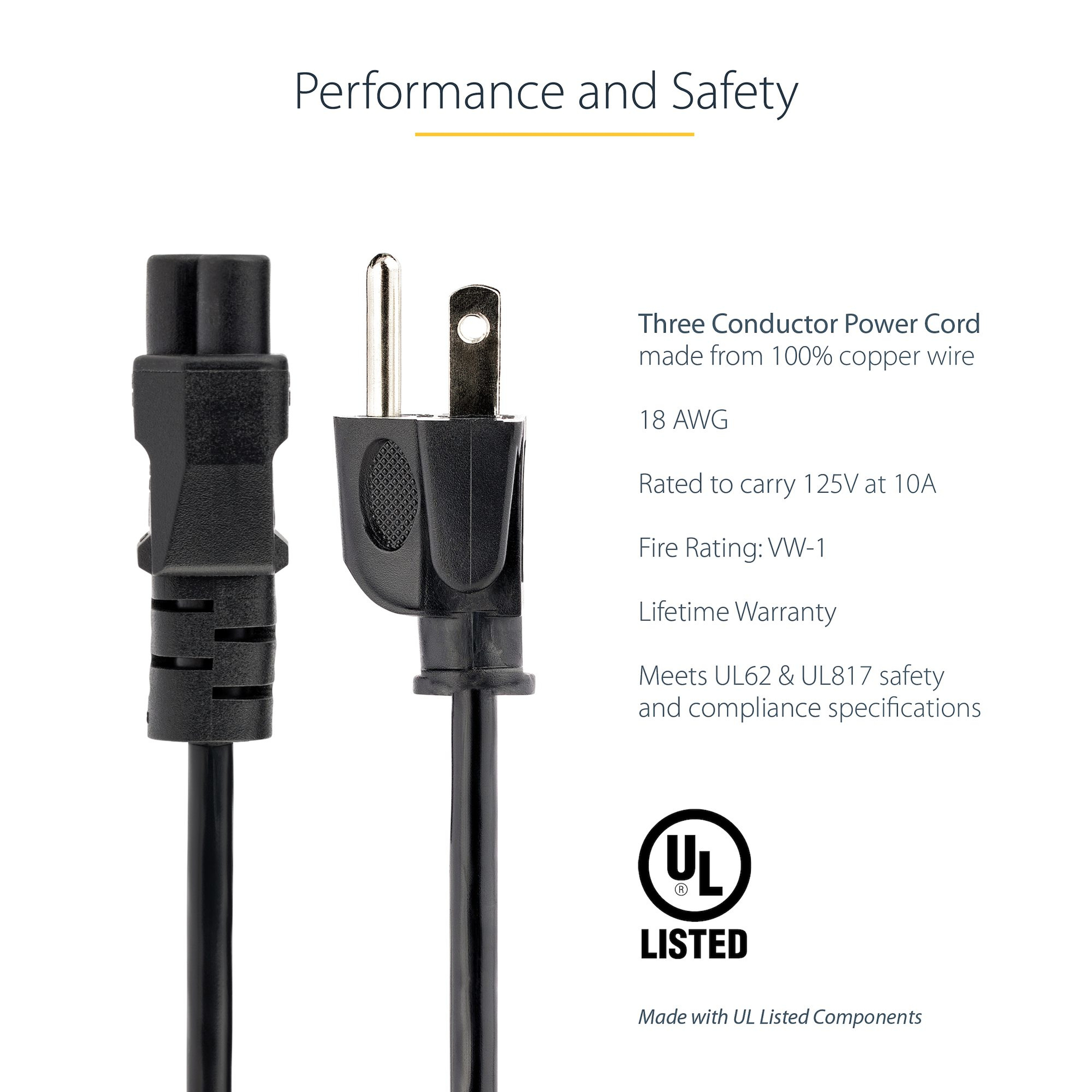 Ensure your devices stay powered with the StarTech.com PXT101NB3S 6ft (1.8m) Laptop Power Cord. This high-quality power cable features a NEMA 5-15P connector on one end and a C5 connector on the other, making it a perfect replacement or spare for your HP, Toshiba, or other compatible laptops.