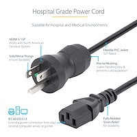 Ensure safety and reliability in medical environments with the StarTech.com PXTMG1016 power cable. This 6ft (2m) hospital-grade power cord features a NEMA 5-15P plug and IEC 60320 C13 connector, designed specifically for connecting computers, monitors, and lab equipment to hospital-grade AC power outlets.
