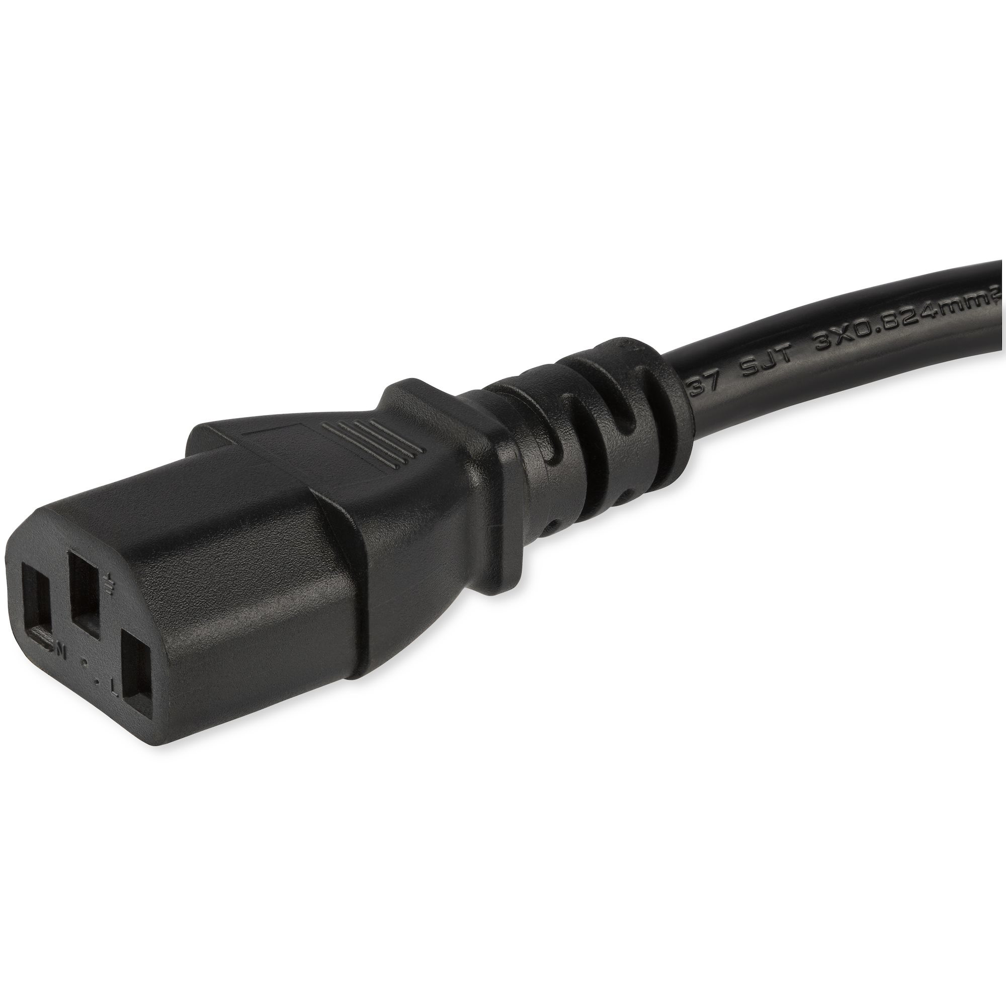 The StarTech.com PXTR10110 is a high-quality 10-foot (3 meter) computer power cord designed to provide a durable and reliable connection for your desktop computers, monitors, printers, and other peripheral devices. Featuring a right-angle NEMA 5-15P plug, this cable is engineered to save space by preventing blockage of adjacent outlets, making it ideal for use with dual AC wall outlets.