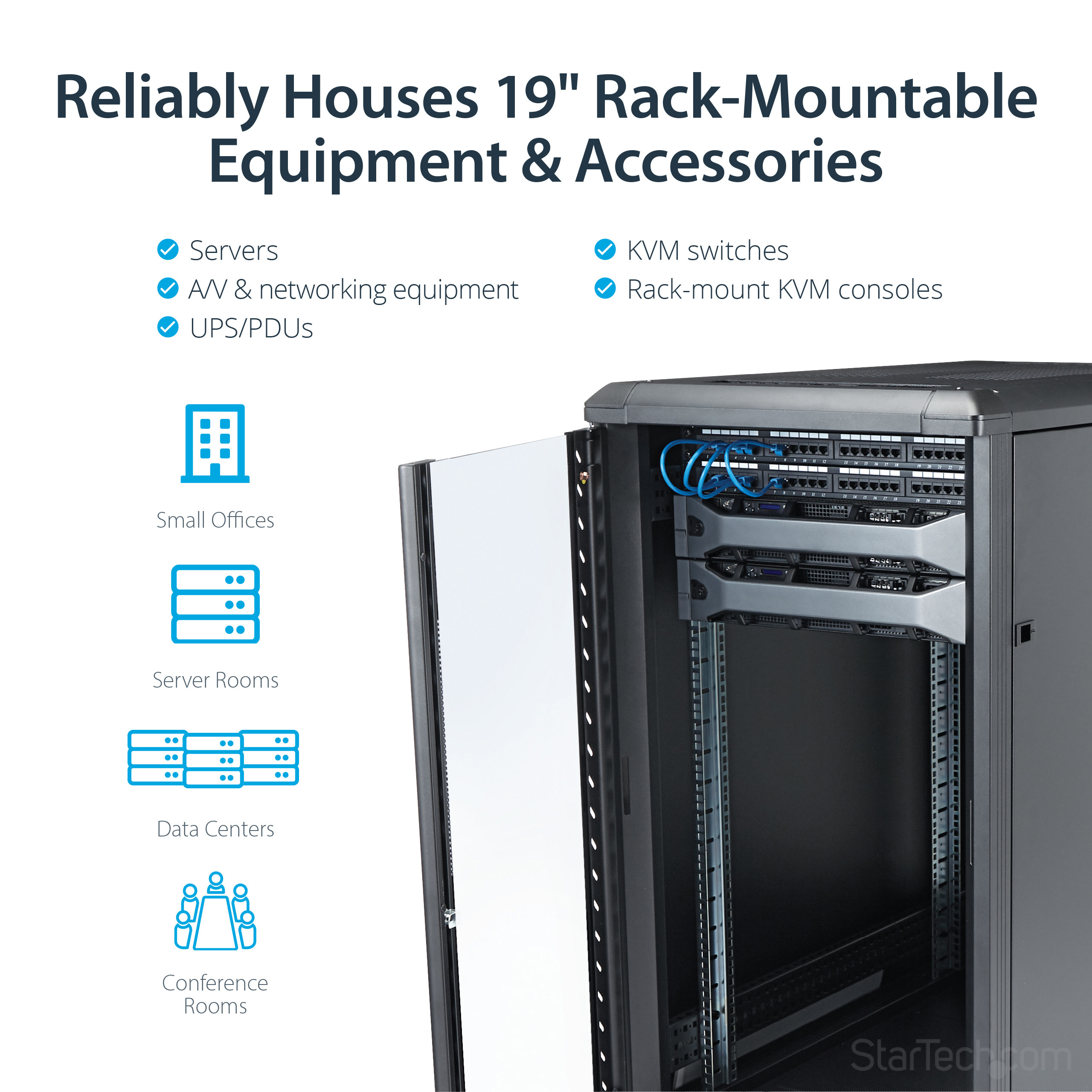 Securely store your servers, network, and telecommunications equipment with the StarTech.com RK2236BKF 22U server rack. This sleek black cabinet offers 22U of storage space, designed to accommodate EIA-310 compliant 19" rackmount devices from leading brands like Dell, HP, and IBM.