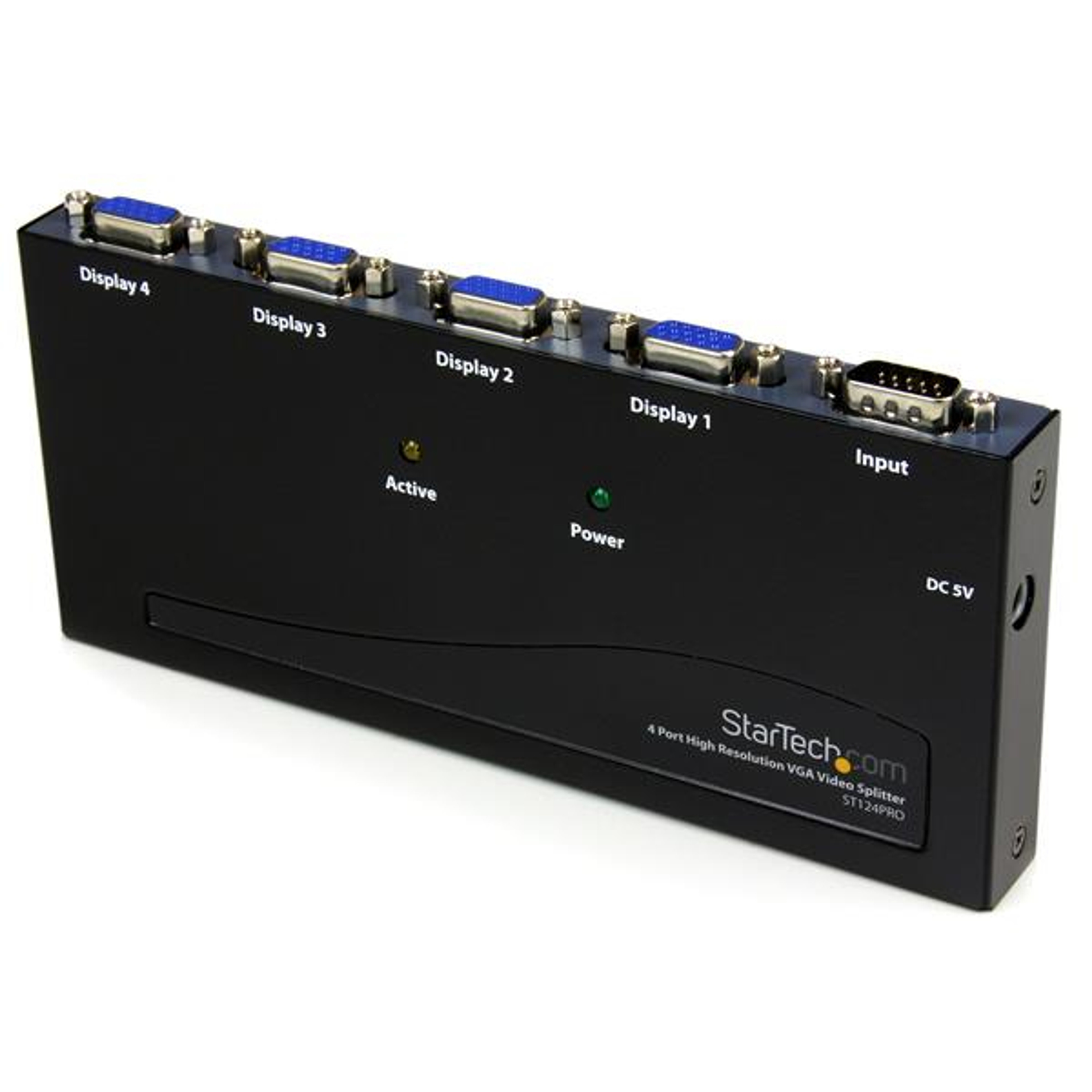 Enhance your presentations and displays with the StarTech.com ST124PRO video splitter, designed to split a single high-resolution VGA video signal to four monitors or projectors simultaneously. This professional-grade solution is ideal for classrooms, tradeshows, and in-store displays, ensuring the highest quality video across multiple screens.