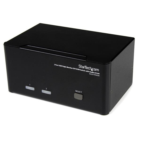 Effortlessly control two multimedia computers with the StarTech.com SV231DDVDUA KVM switch. This dual monitor KVM switch allows you to share a keyboard, mouse, and two displays (one VGA and one DVI) between two computers, providing a seamless multimedia experience.