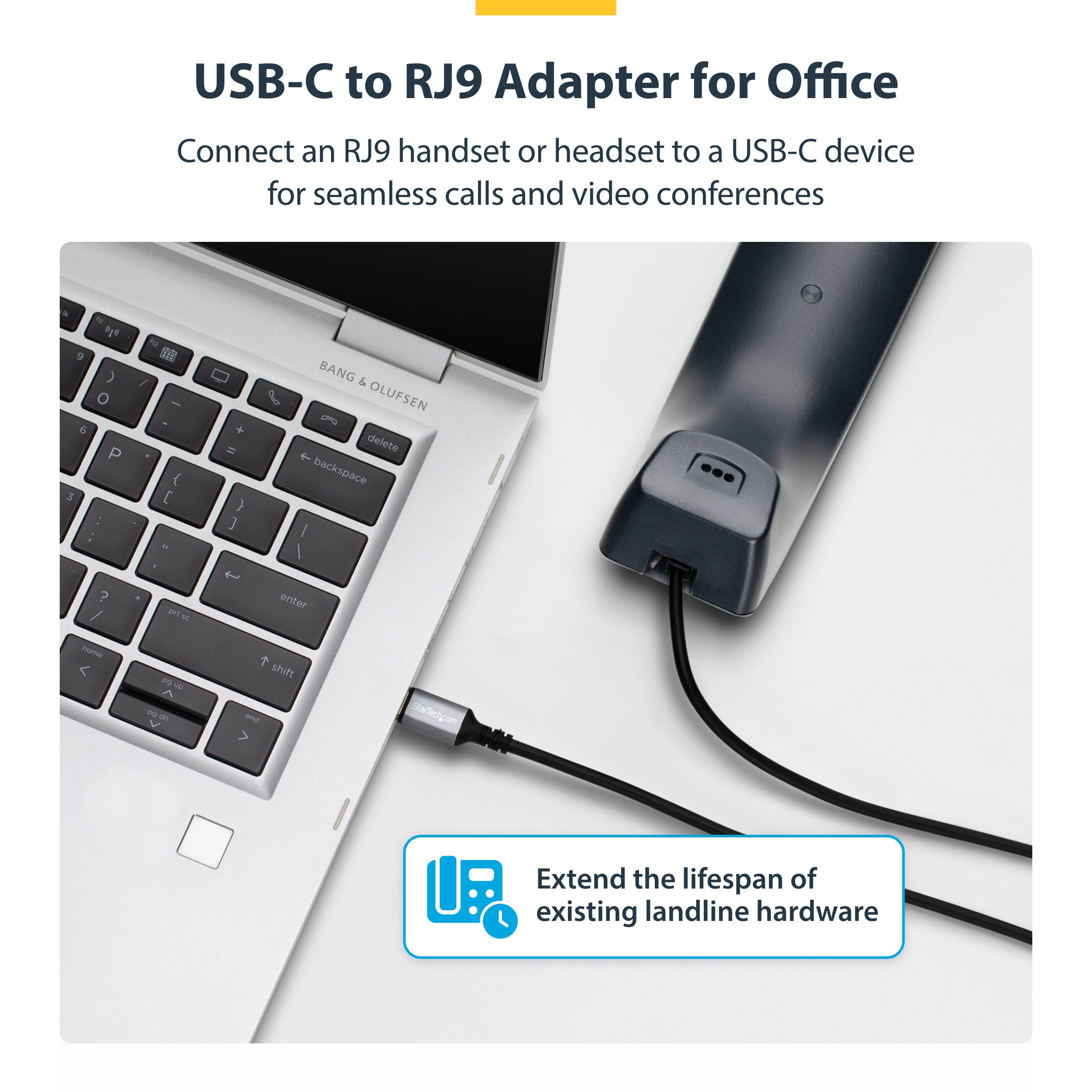 This adapter is perfect for users needing to bridge modern USB-C devices with legacy RJ-9 headset connections, ensuring clear audio communication and ease of use.