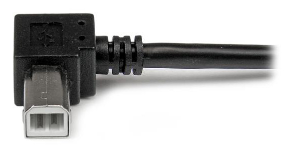 The cable includes a USB A straight male connector on one end and a right-angle USB B male connector on the other, allowing for convenient installation in narrow or tight spaces. This angled design is ideal for connecting USB 2.0 printers, scanners, external hard drives, and other peripherals where space is limited.